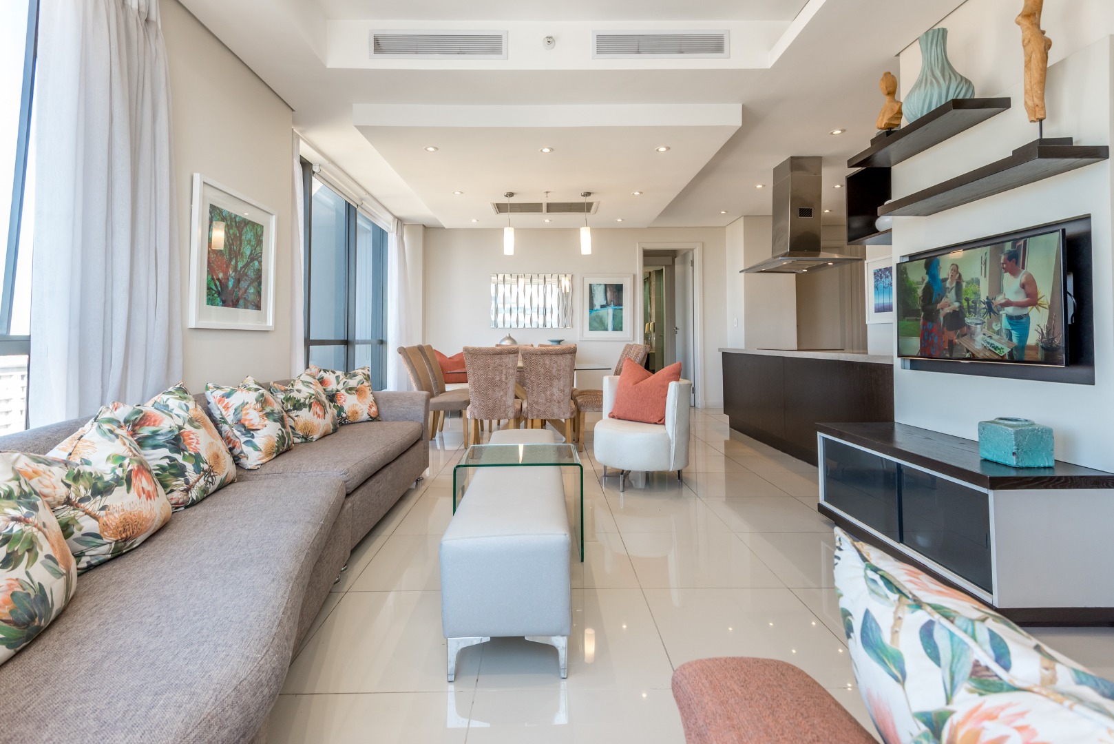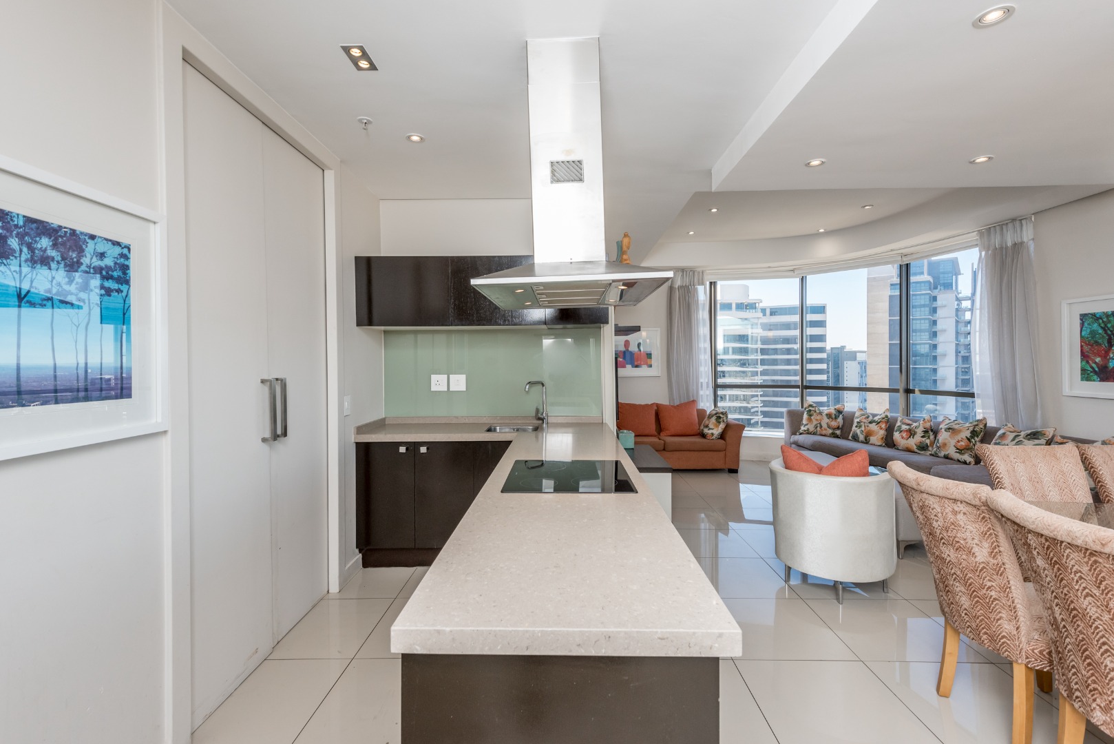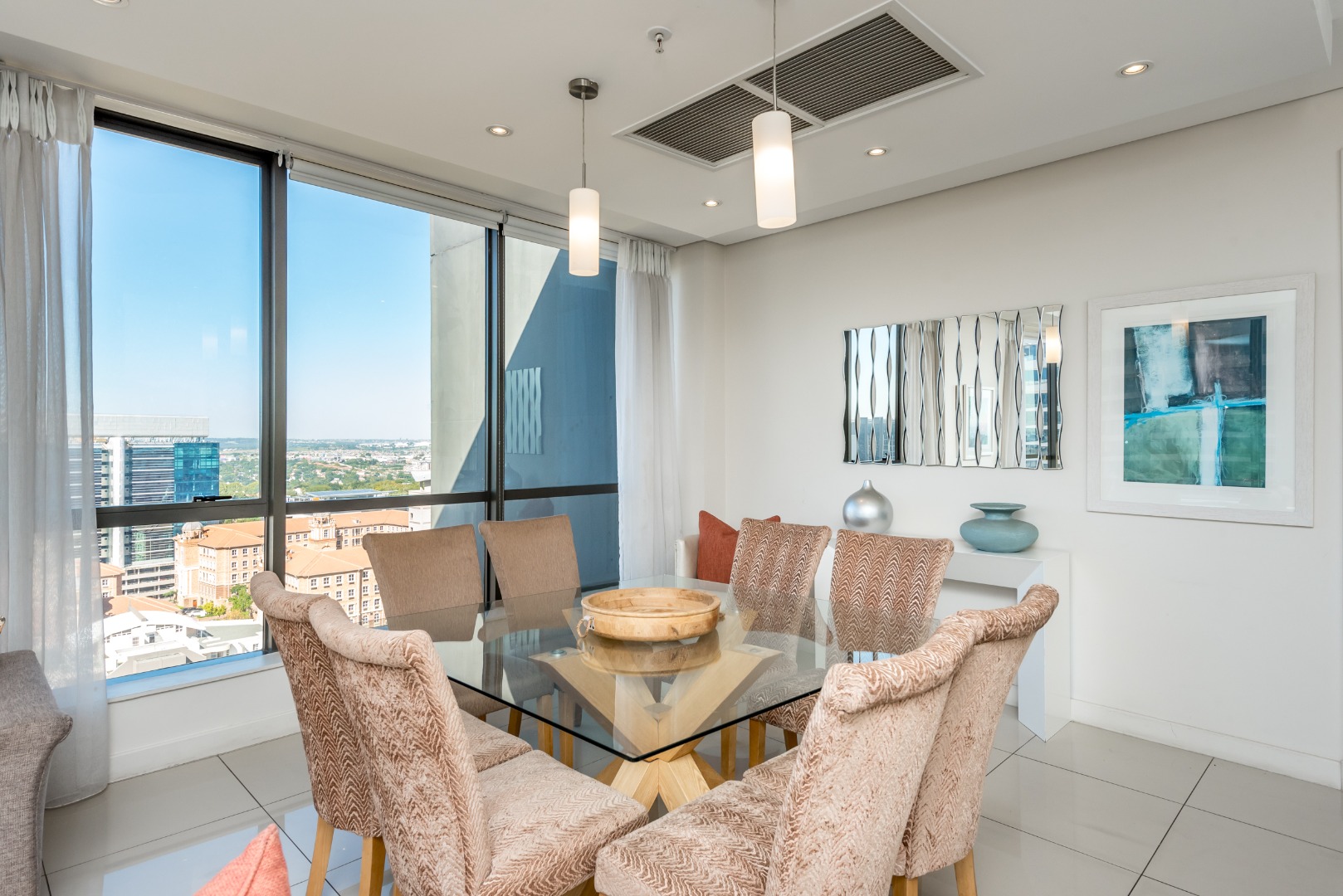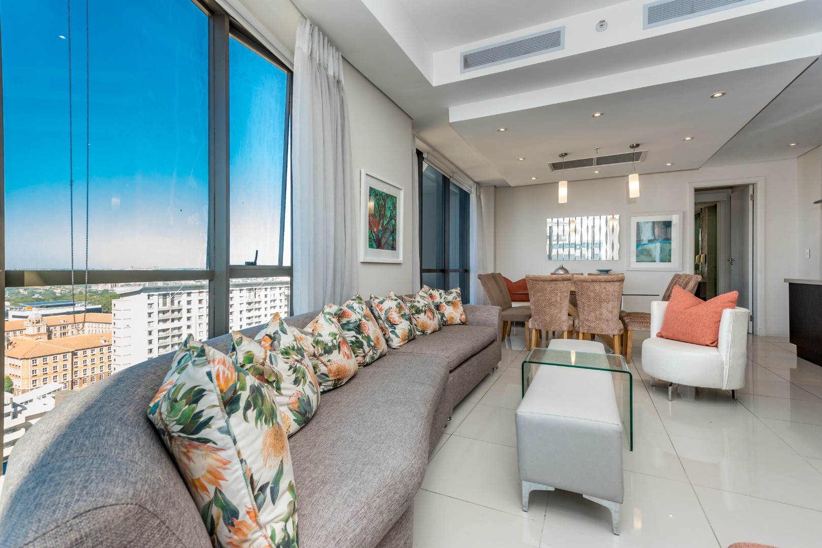 The spacious open-plan lounge and dining area is framed by dramatic floor-to-ceiling windows that flood the apartment with natural light while showcasing spectacular birds-eye views across Sandton and beyond.