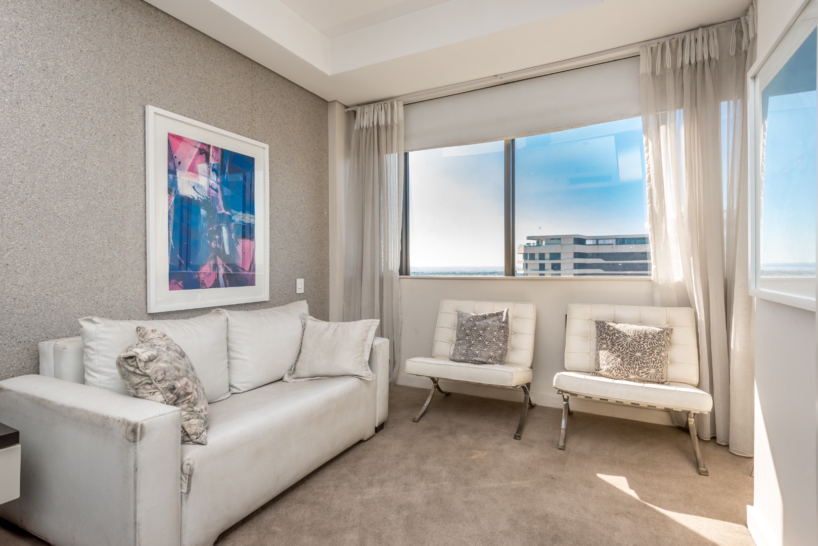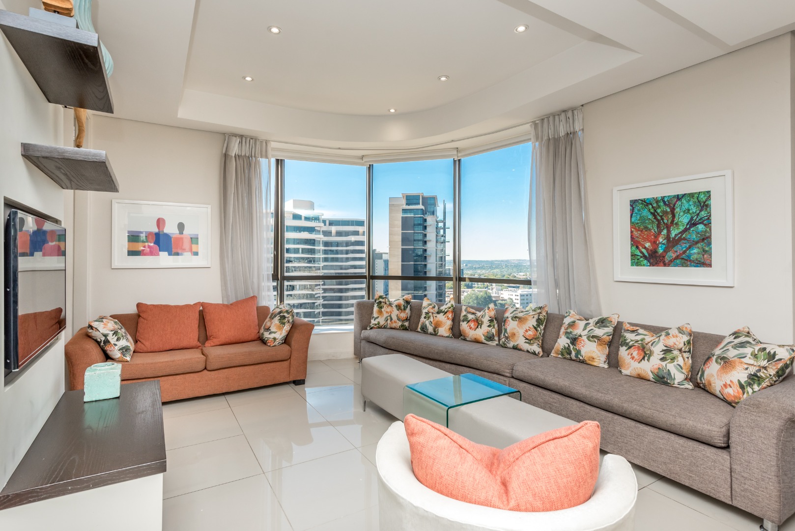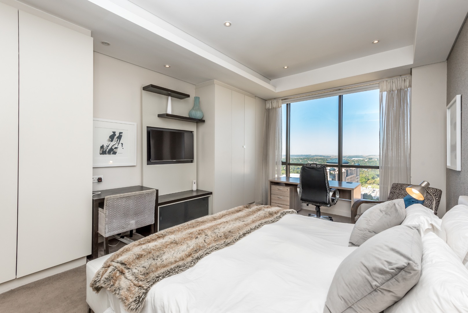 Perched on the 15th floor of the iconic Sandton Skye, this fully furnished executive apartment offers sophisticated urban living with sweeping 180-degree views across Johannesburg’s skyline.