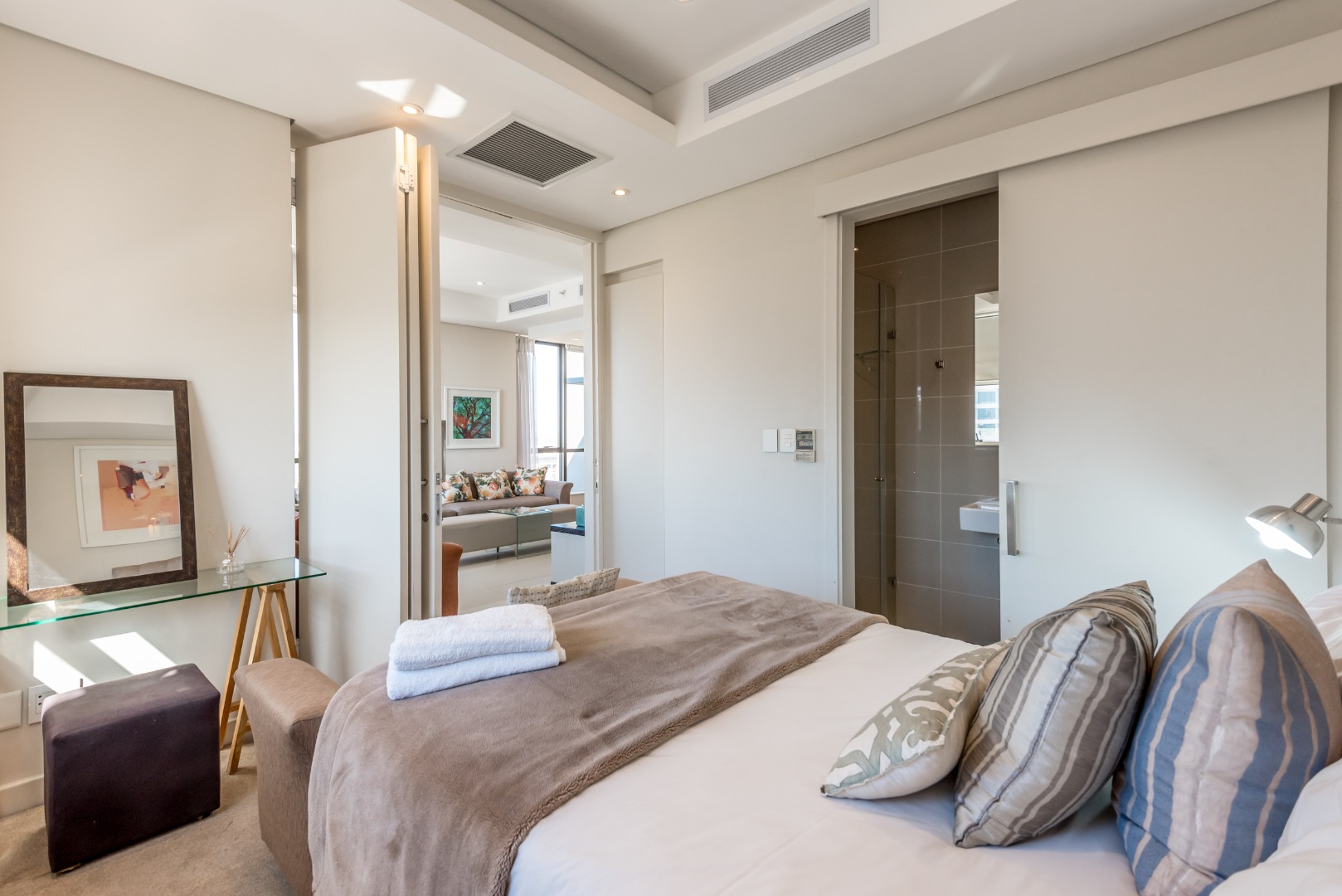 Three luxurious en-suite bedrooms provide generous accommodation. The main suite enjoys exceptional views and a full bathroom with double vanities. The second bedroom features its own en-suite bathroom with shower.