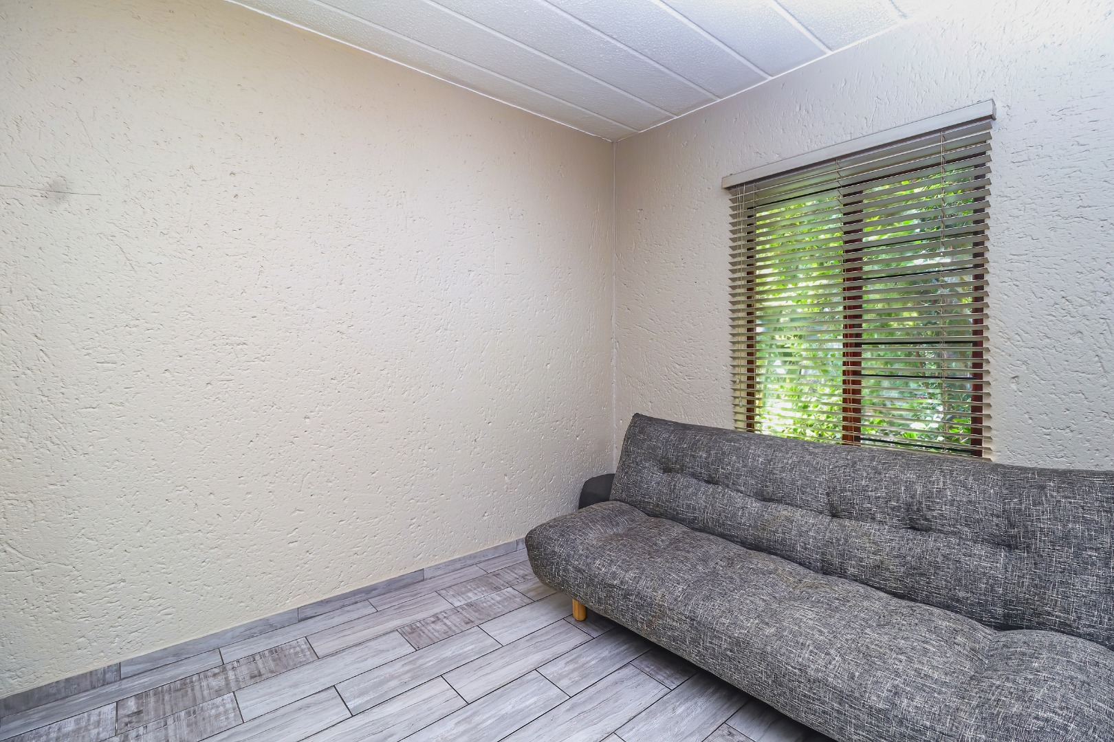 The heart of the home is its modern kitchen - featuring sleek white cabinetry, dark marbled countertops, and a chic black subway tile backsplash. Equipped with an integrated oven and hob, it also includes a convenient breakfast bar for casual dining. Large sliding glass doors flood the living space with natural light and provide direct access to a private patio, offering scenic green views and a covered outdoor area for enjoyment.