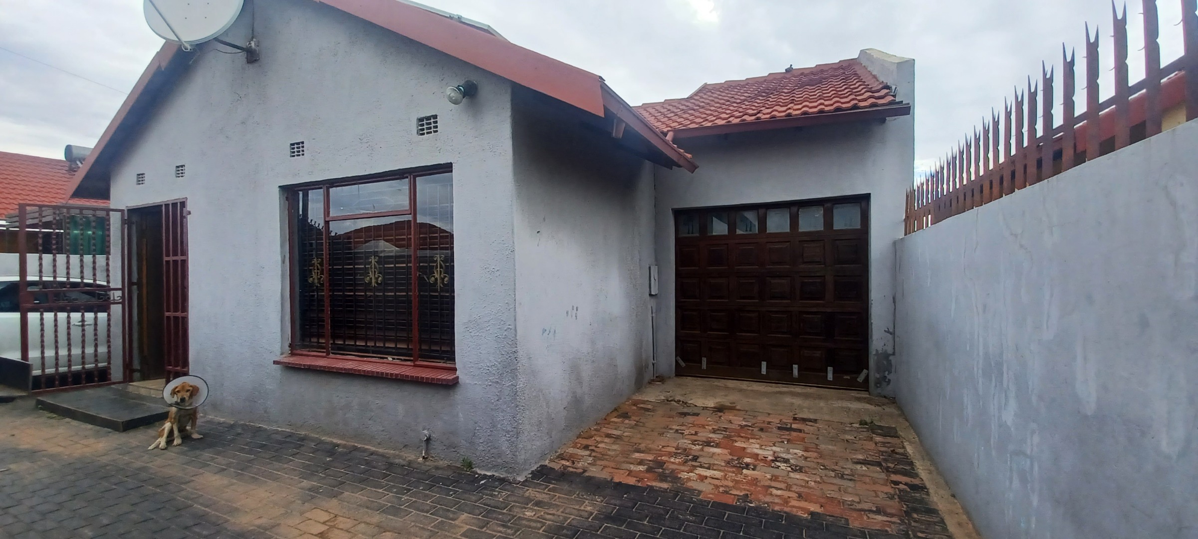 Upon arrival, the property immediately conveys a sense of security with its ornate metal front gate, robust perimeter wall, and paved frontage. The single-story house features a durable tiled roof and a light grey stucco exterior, complemented by security gates and bars on windows for enhanced safety. An attached single-car garage provides convenient parking, while a large, fully paved brick courtyard offers ample outdoor space for various activities.