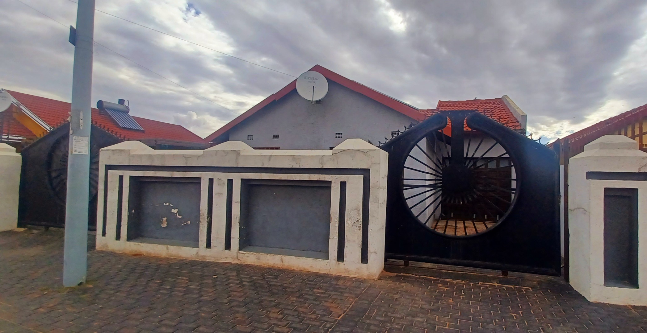 Sustainability is a key feature, with a solar water heater visible on the roof and solar panels installed, contributing to energy efficiency and reduced utility costs. The property's comprehensive security is fully gated, and window bars, provide peace of mind.