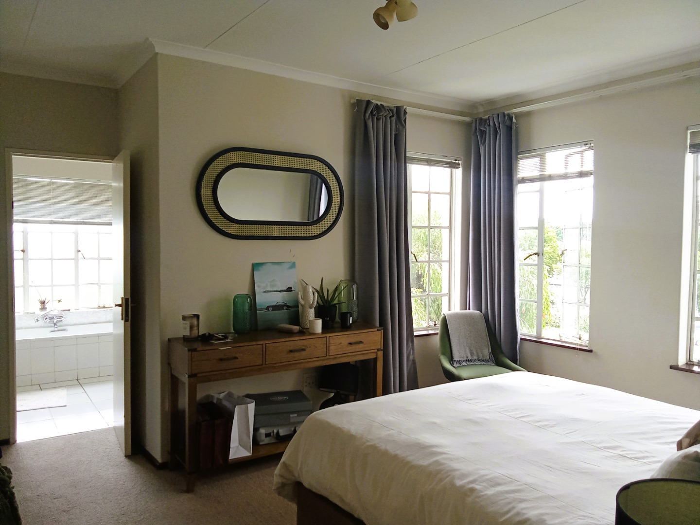 4. Bedrooms: 3 well-sized carpeted rooms with built-in cupboards. The master suite includes a walk-in closet
