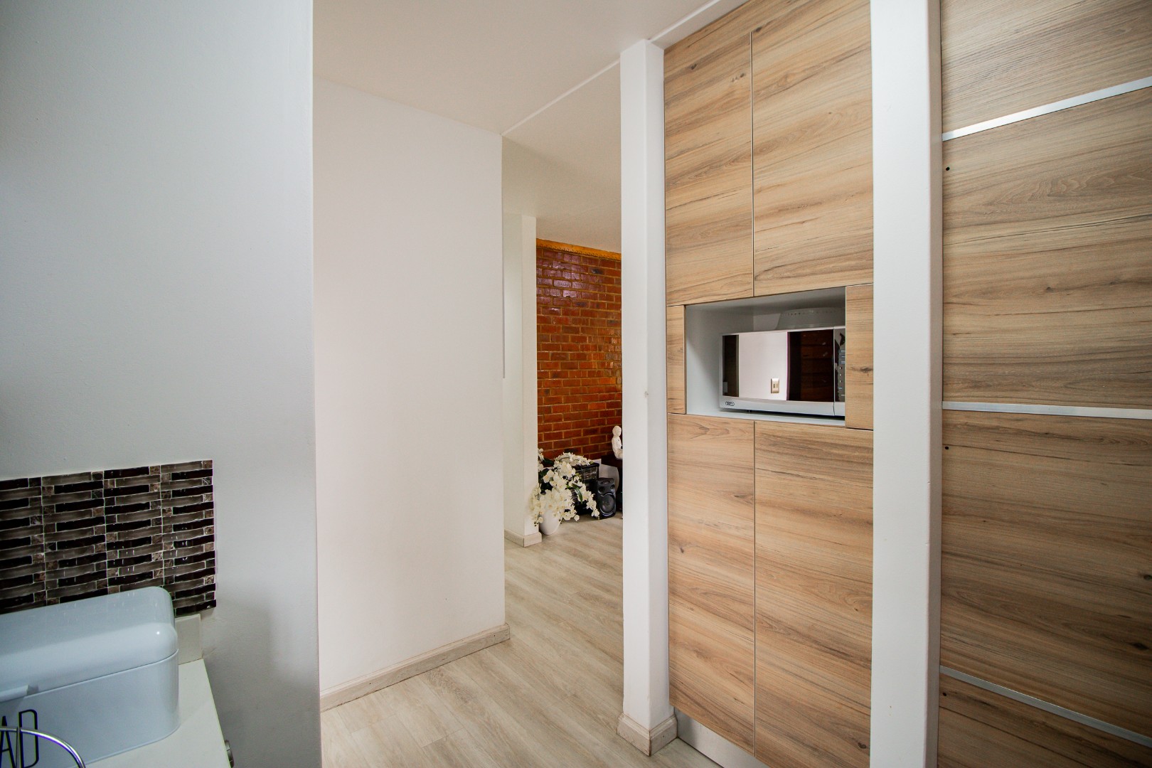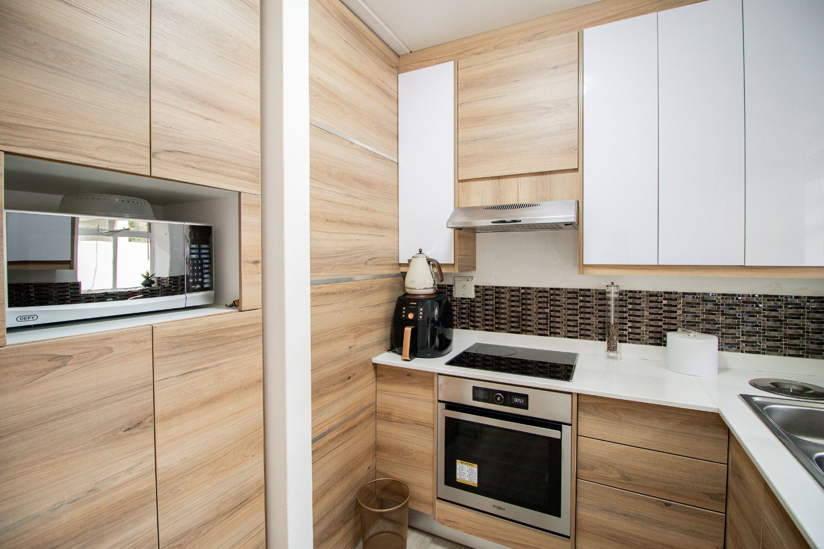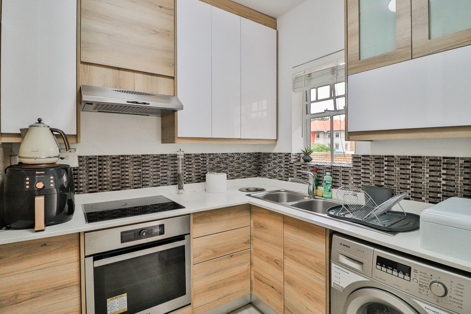The apartment features two well-sized bedrooms with built-in cupboards. The main bedroom includes a private en-suite bathroom and a sliding door opening directly onto a private garden, creating a serene retreat. A second full family bathroom serves guests and the additional bedroom. The stylish, fully fitted kitchen with modern finishes flows seamlessly into a bright lounge. This living space offers dual access to the private garden