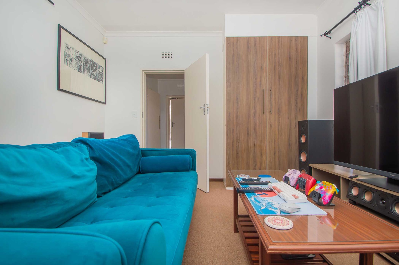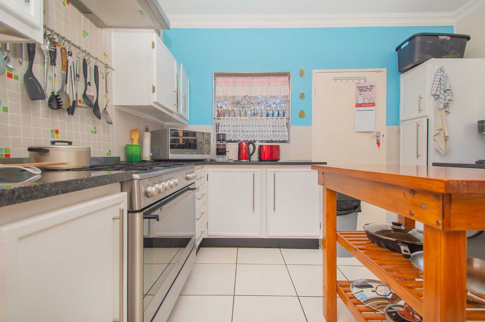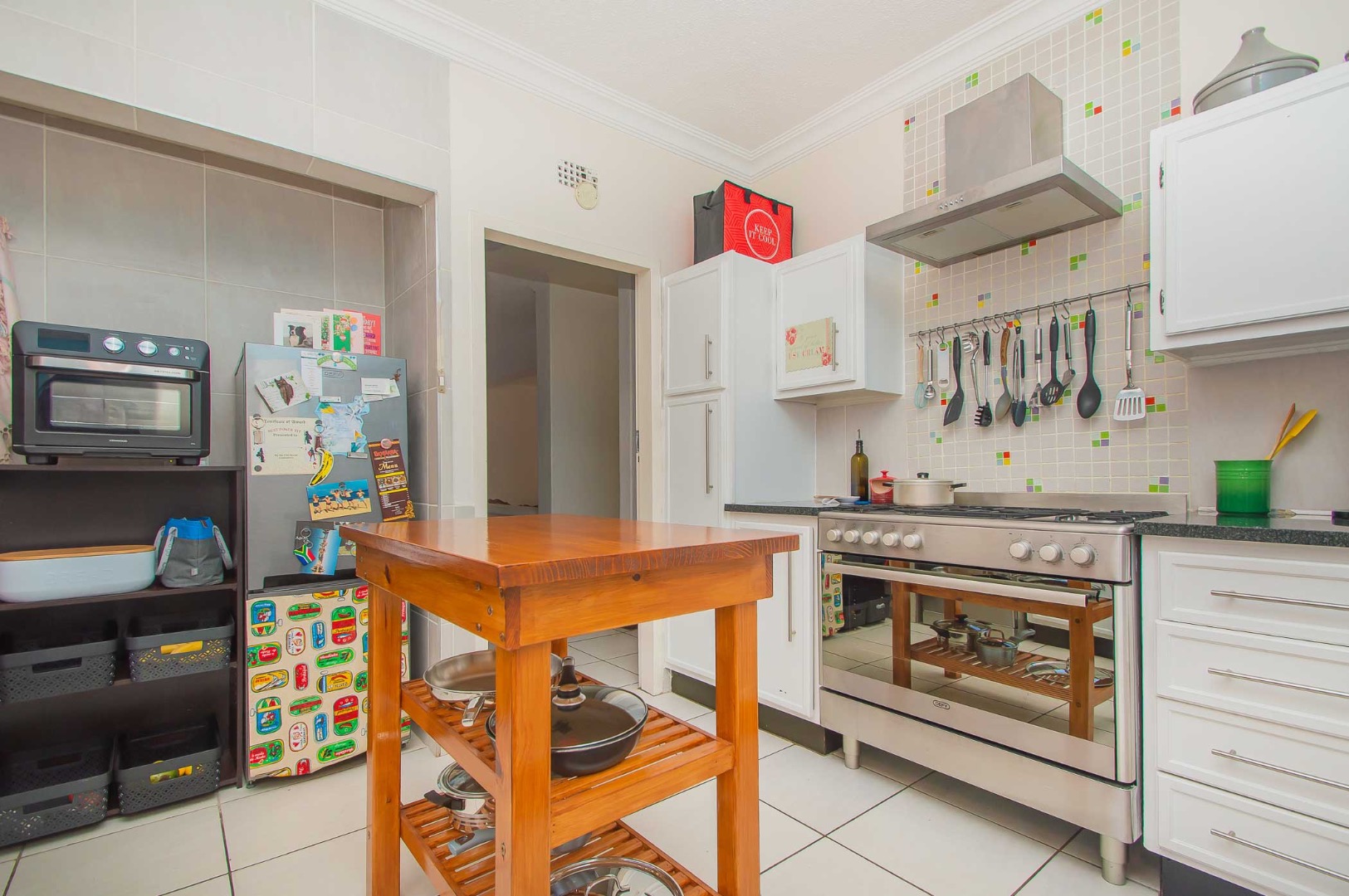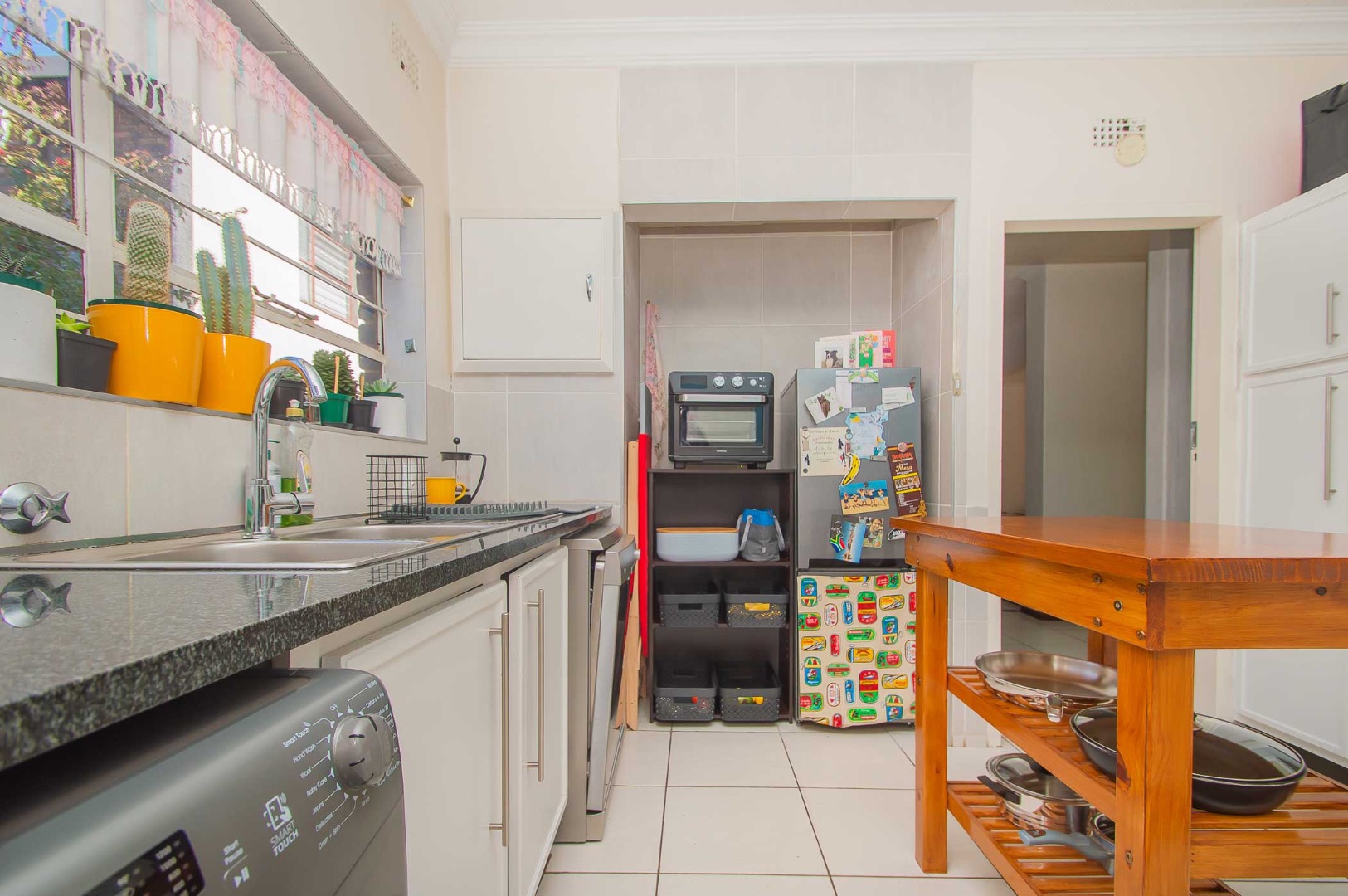 The unit offers a spacious kitchen with fittings for 2 water appliances, a double door fridge and a gas stove.