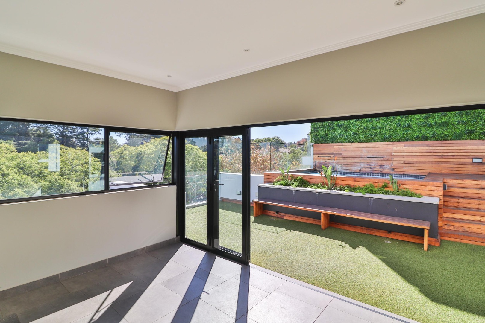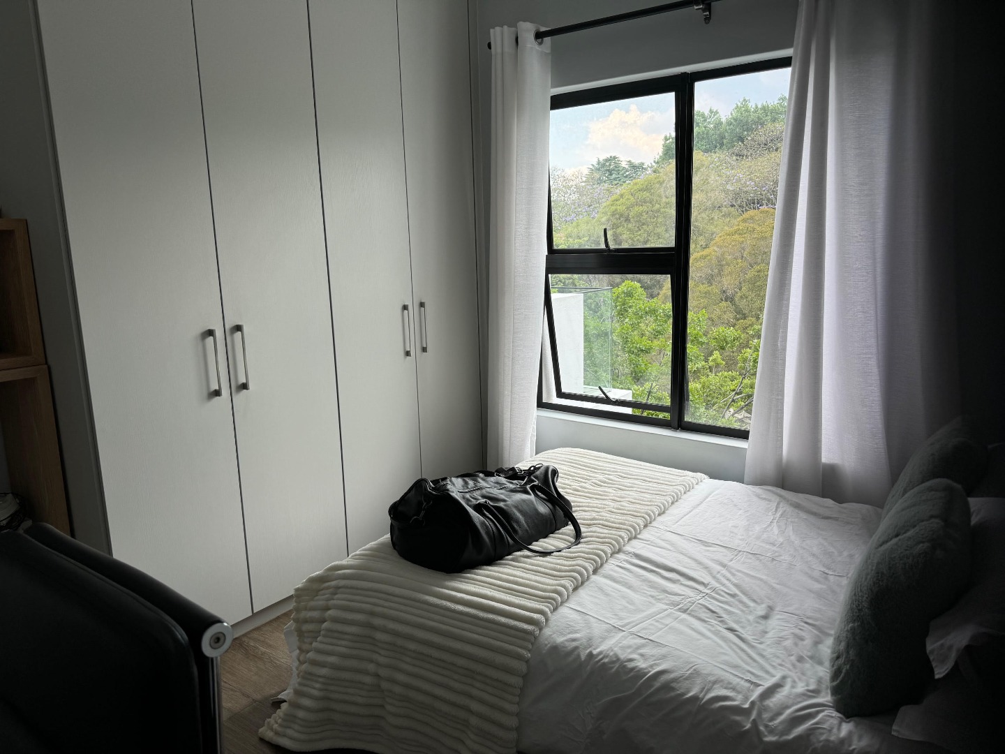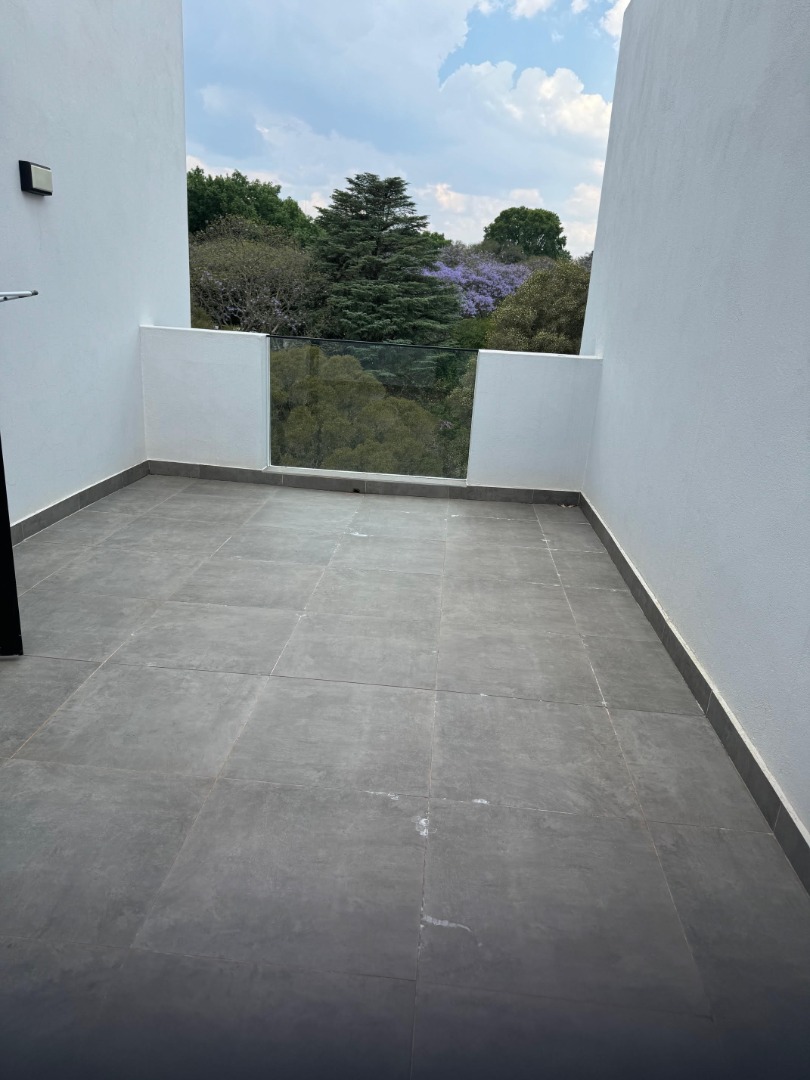 The bright airy living room with space for lounge and dining room. and a lovely patio set in the leafy Rosebank quiet streets. The second patio is a large outside patio and is wonderful to enjoy the beautiful sunny weather Jozi has to offer, the patio is a perfect spot to relax and unwind after a busy day. Penthouse has a very large balcony to setup seated or dining area and lounges.