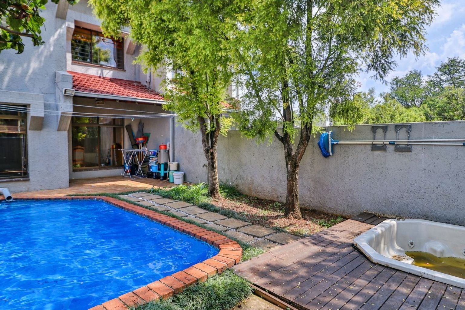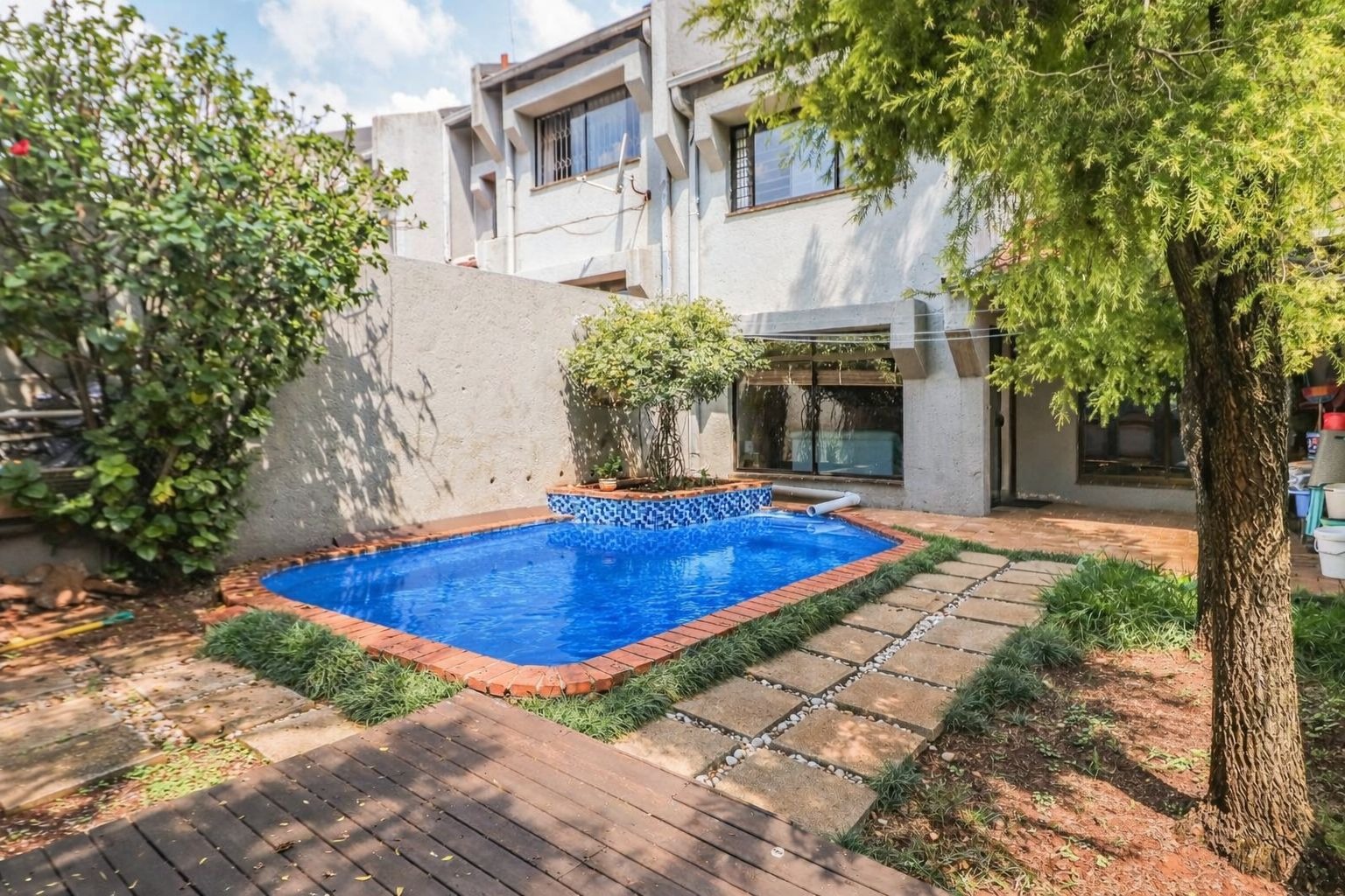Outdoor living is catered for with a private patio, perfect for enjoying the South African climate, and a refreshing swimming pool, ideal for leisure and recreation. The property also benefits from two parking spaces.