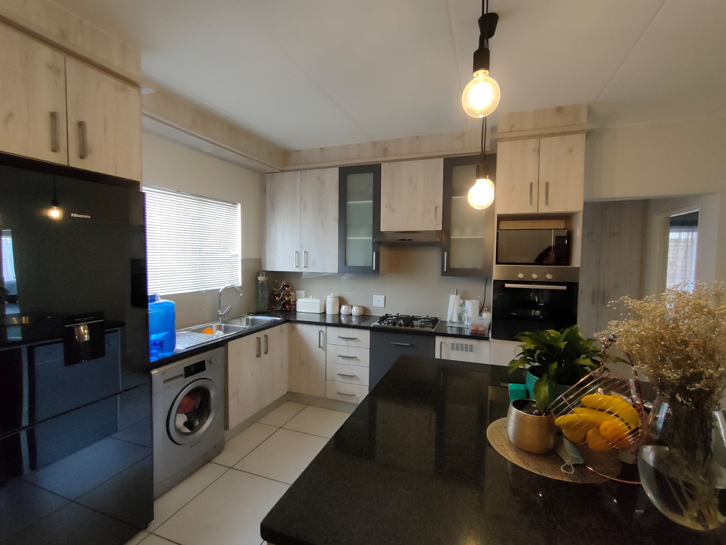 Inside, you'll find a bright and spacious lounge and a dedicated dining area, perfect for relaxing or entertaining. The modern kitchen is a real highlight, boasting light wood-look cabinets, sleek dark countertops, integrated oven and hob, plus a handy central island with a breakfast bar. Ample storage and space for your appliances make daily life a breeze.