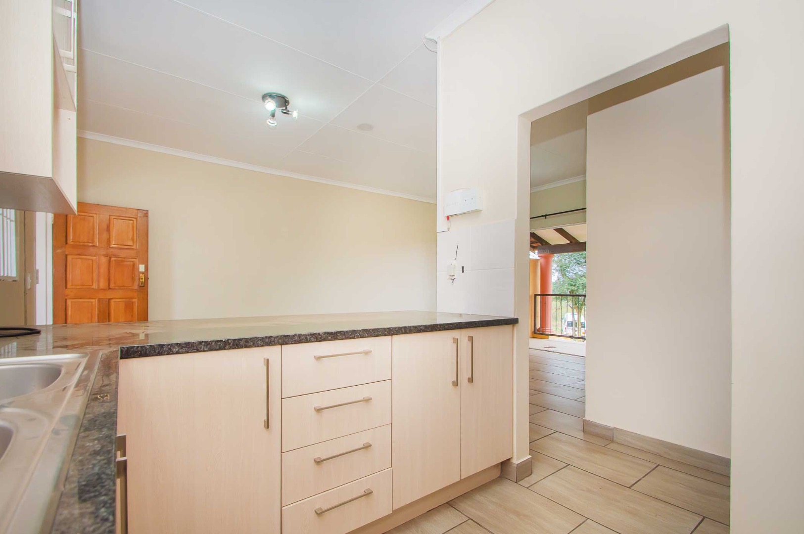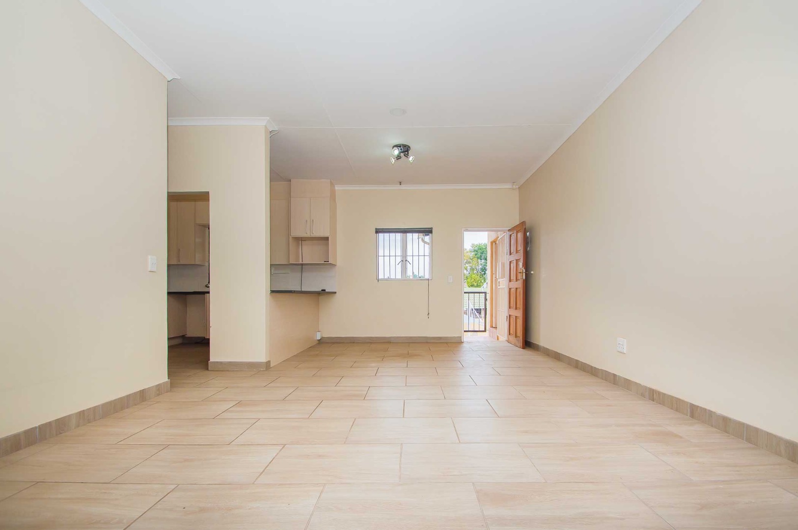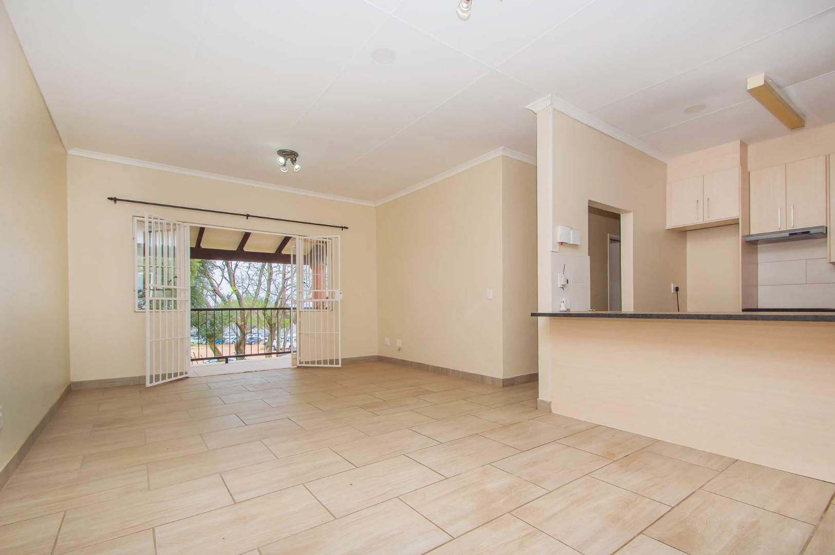 The modern open-plan kitchen boasts granite countertops, ample soft touch cupboard space, and room for appliances, flowing seamlessly into a spacious lounge and dining area. Sunlight fills the space, creating an airy, inviting atmosphere. Double doors onto a private balcony, perfect for entertaining, enjoying a braai, or a quiet morning coffee.