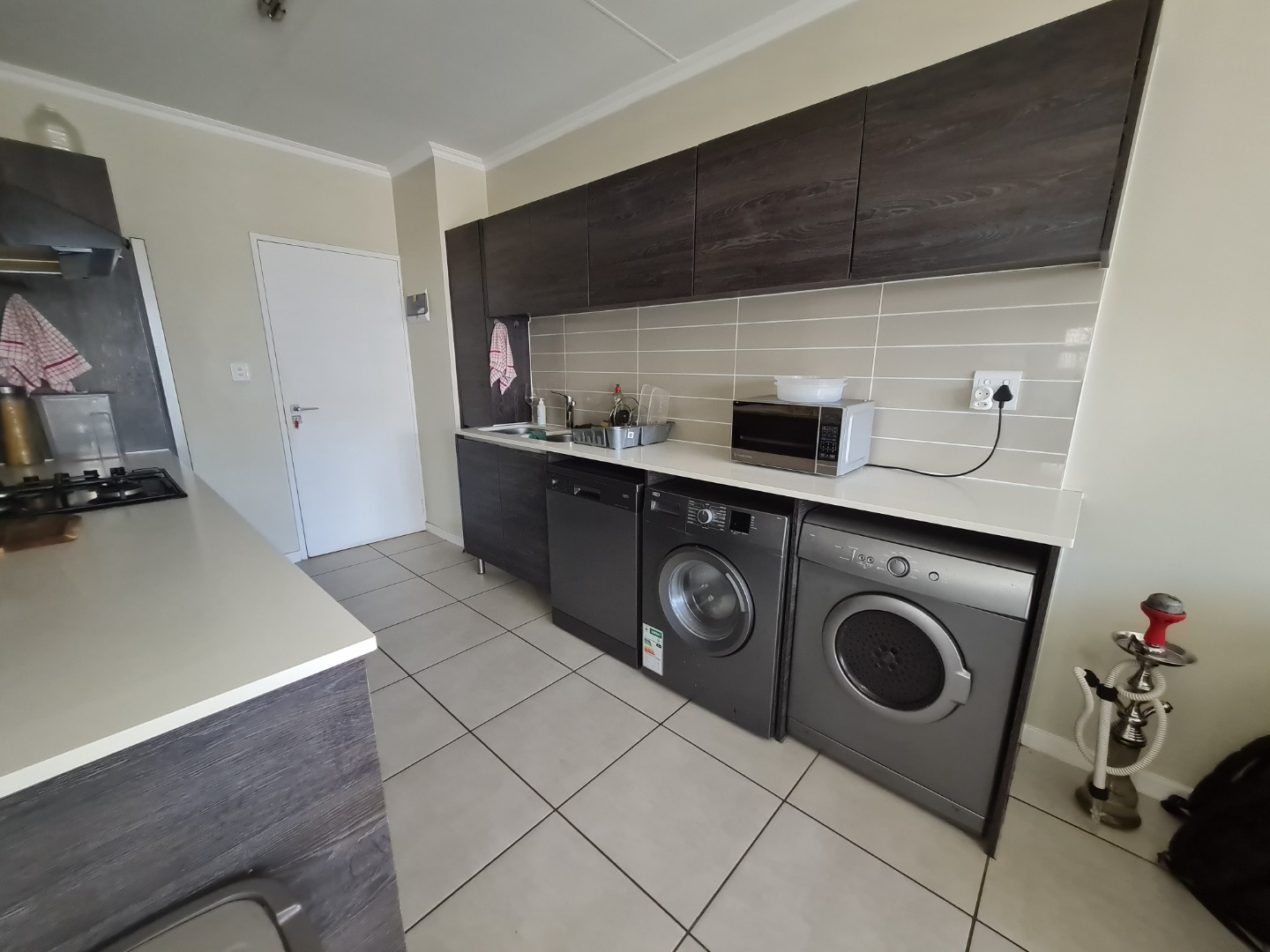 Fully furnished bigger apartment consisting of a bright and sunny bedroom with bed and desk and fitted blinds. Separate bathroom with shower. Good sized lounge with feature wall and covered balcony TV bracket, couch and patio furniture and curtains supplied. Open plan kitchen which is well fitted with 4 appliances, fridge, washing machine, tumble dryer and dishwasher. Covered parking. Comprising of lounge suite :Patio furniture, Crockery, cutlery ,bed and desk with chair