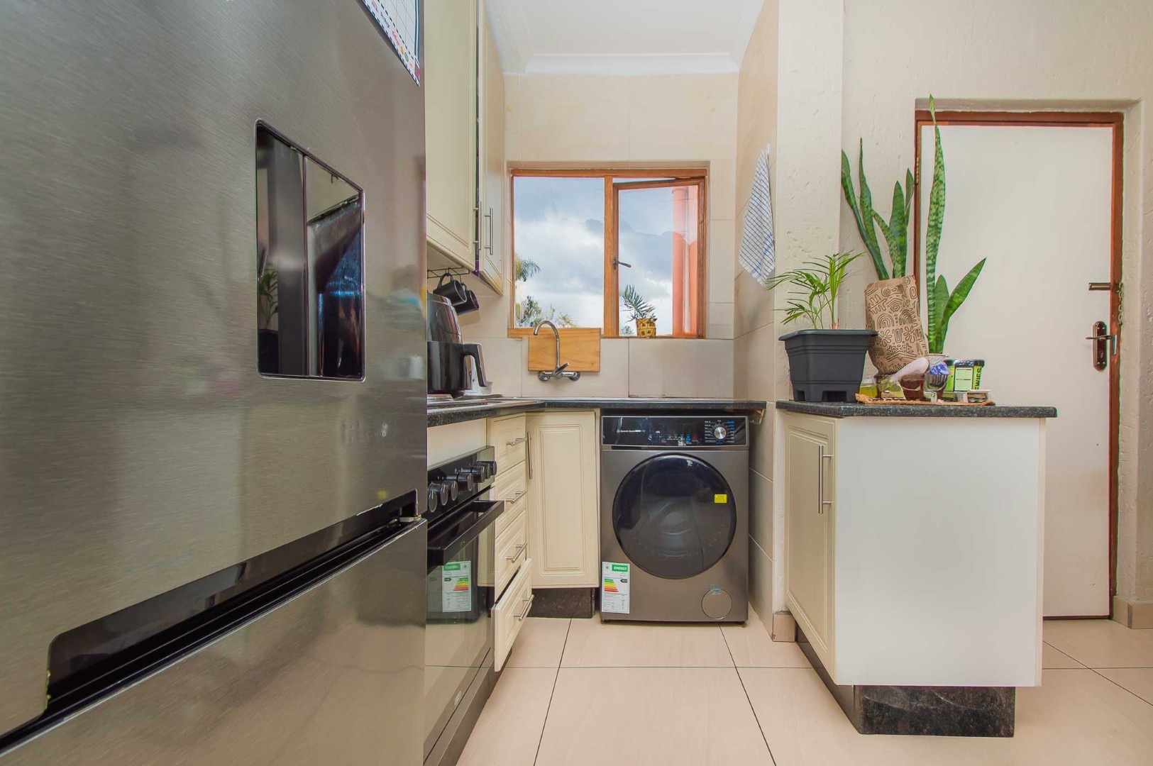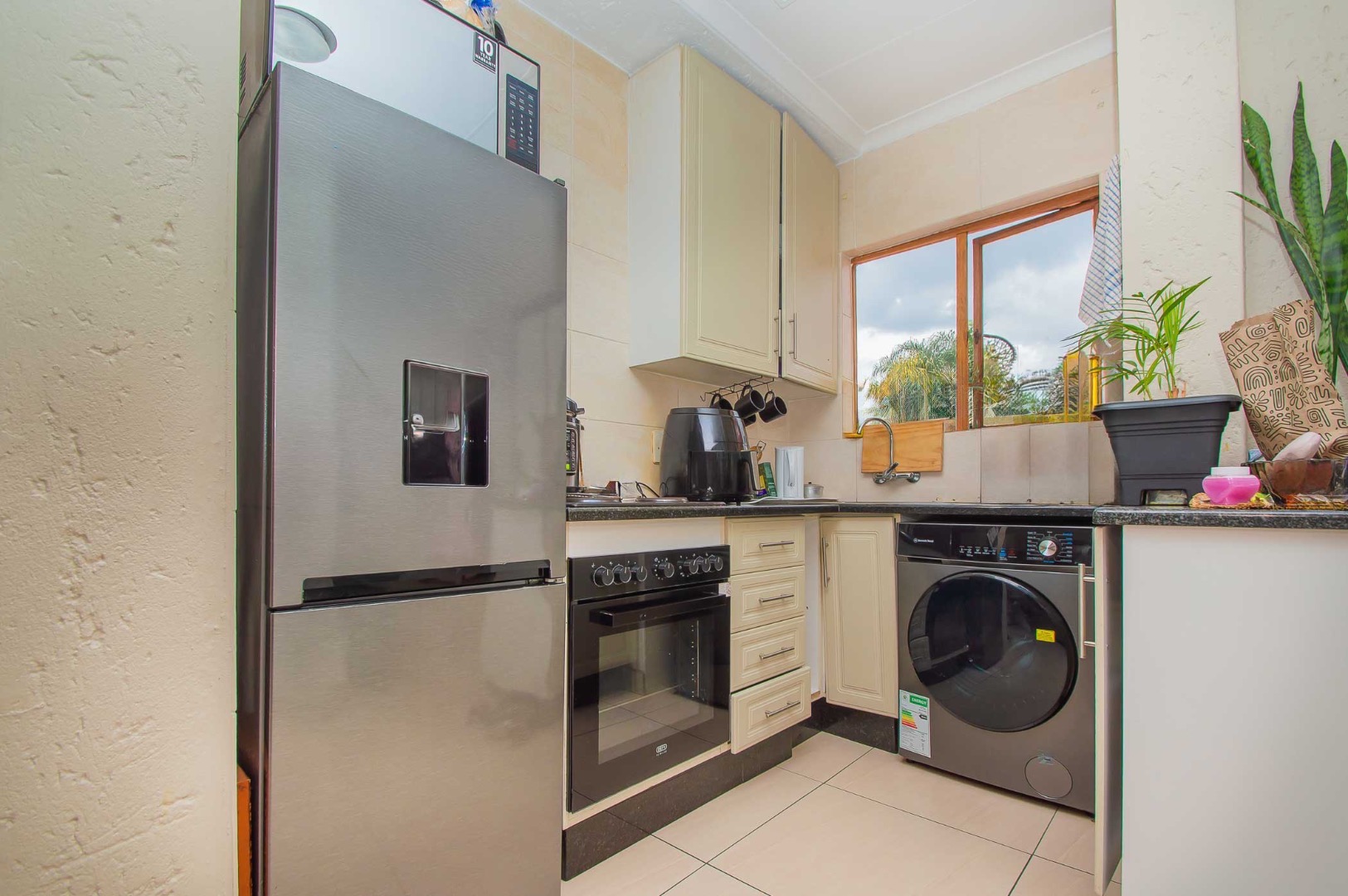 The unit offers a cosy kitchen with space for 1 water appliance and a single fridge