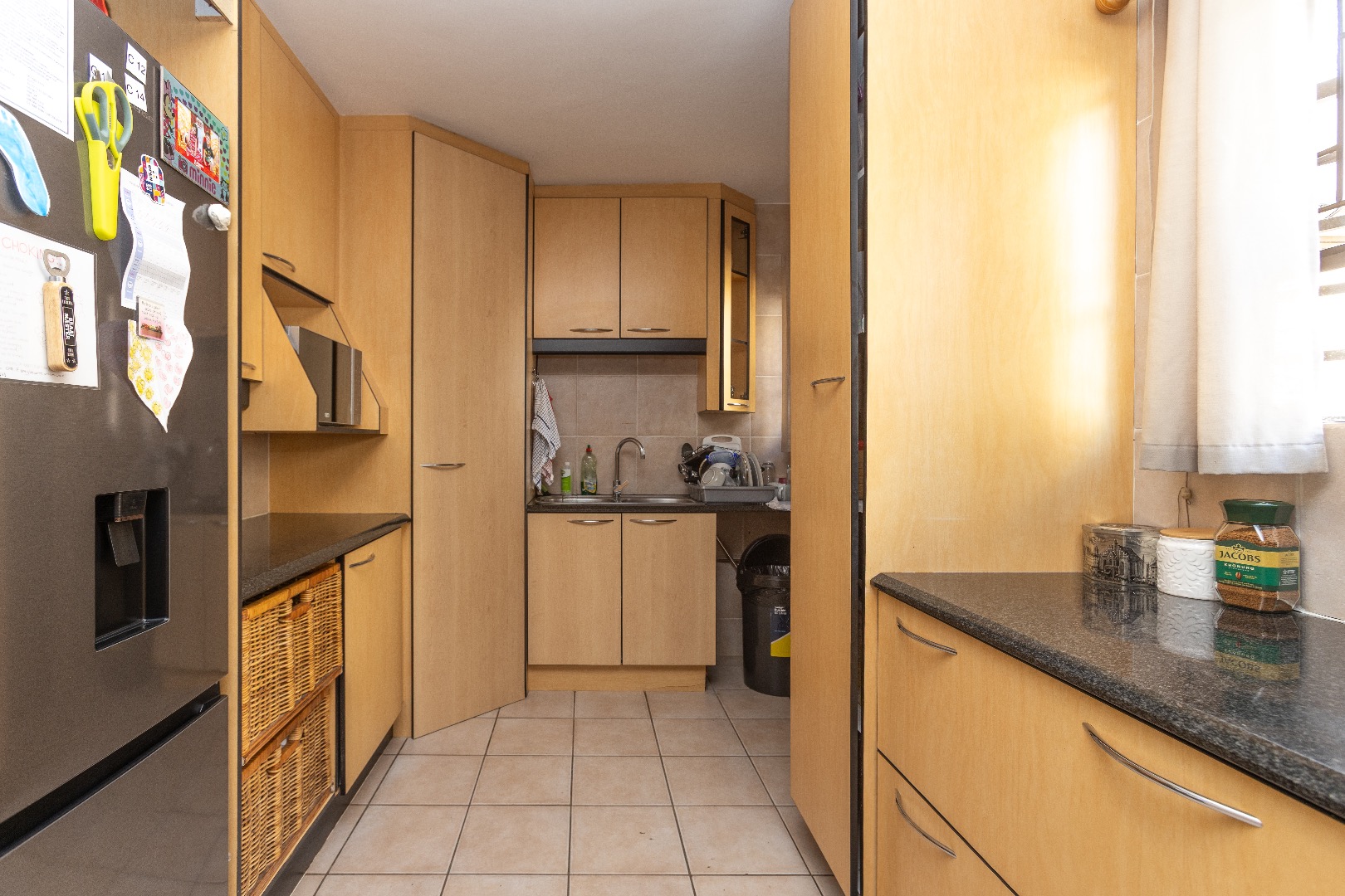 The home offers a neat kitchen which offers ample cupboard space and complete with gas hob, space for 1 undercounted appliance (washing machine is fitted in the garage) and space for a single door fridge as well as a breakfast nook.