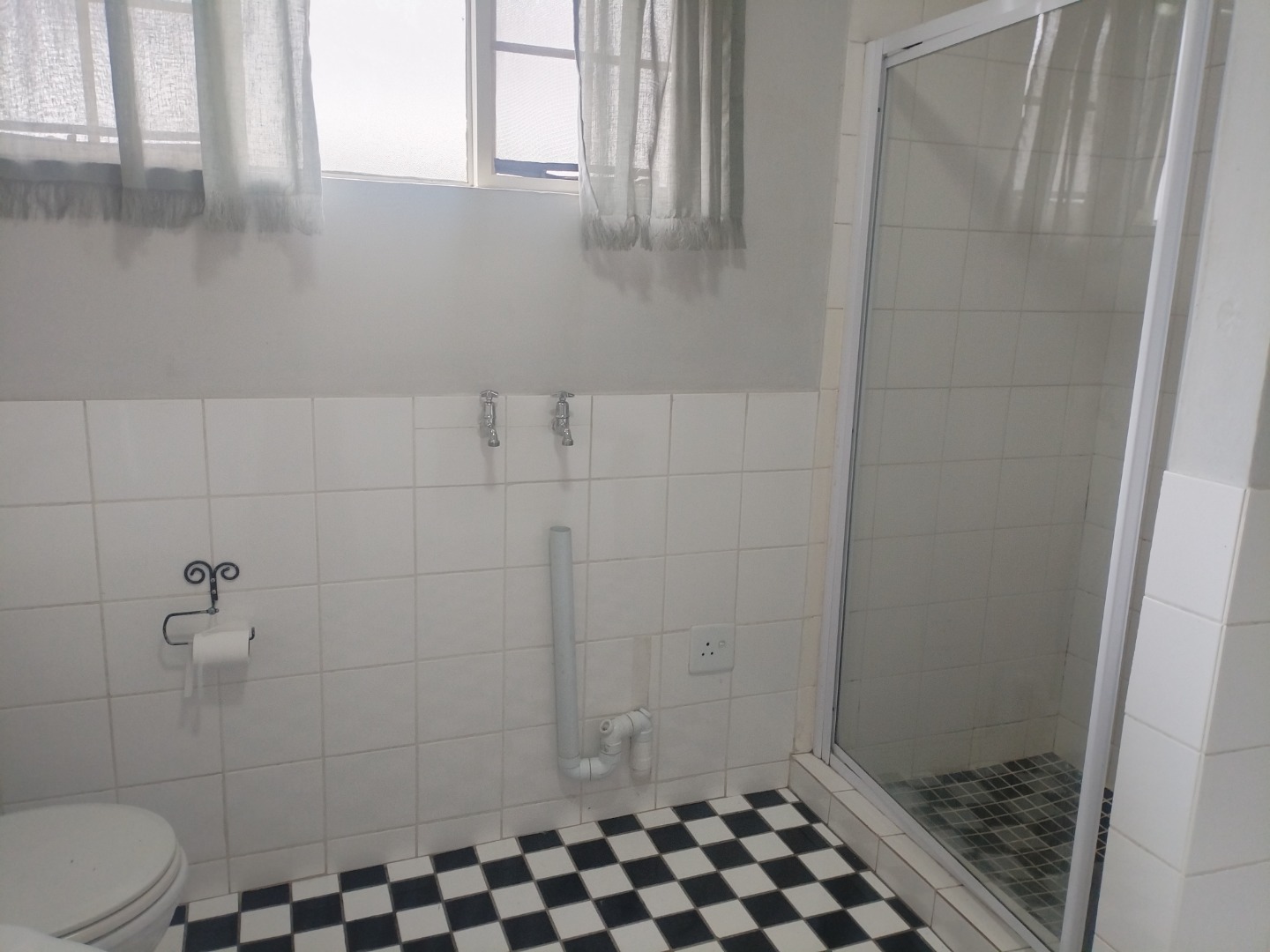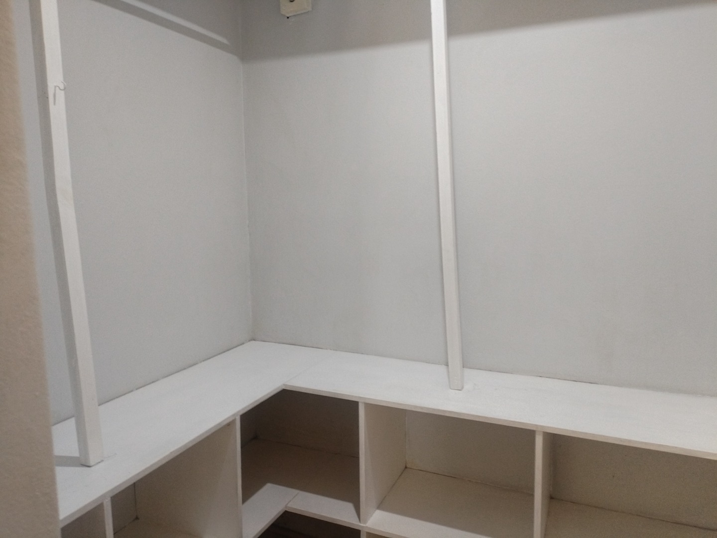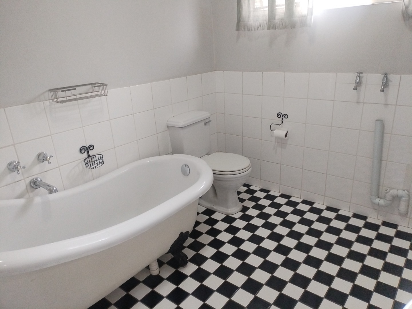 The generously sized bedroom includes a walk-in cupboard, while the large bathroom is fitted with a shower, bathtub, and basin.