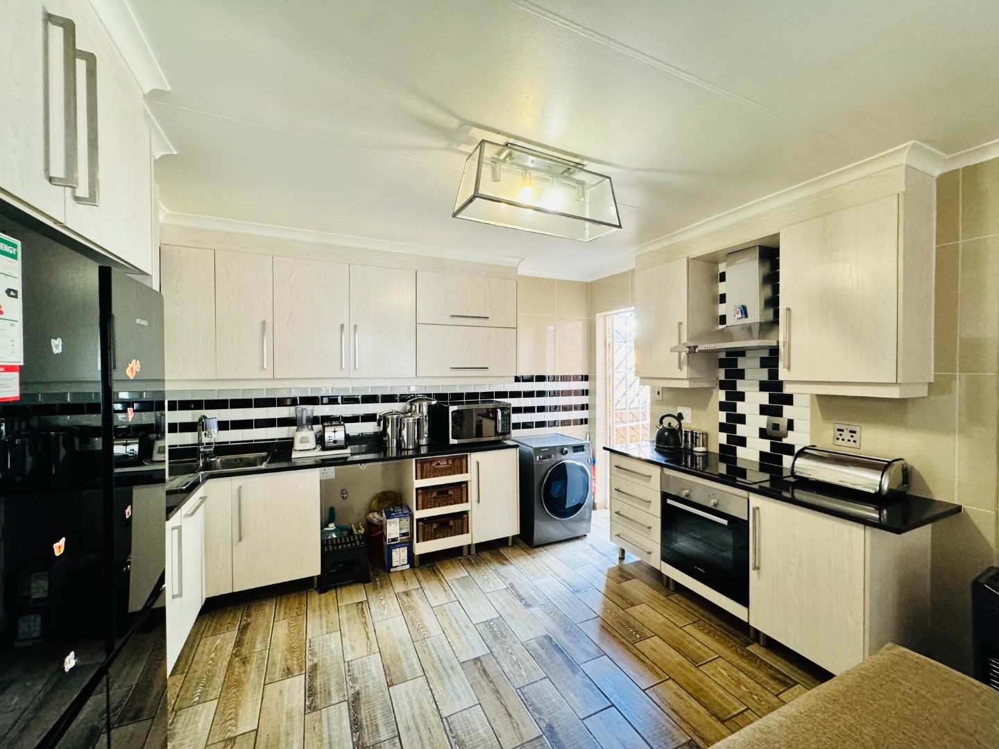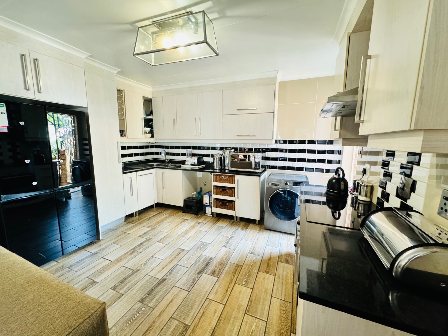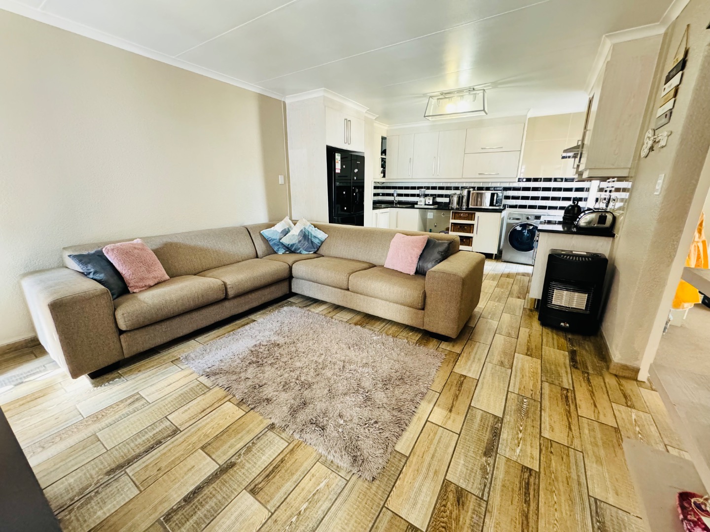 Discover this inviting 2-bedroom, 2-bathroom rental property located within a desirable complex in Bergbron, Roodepoort. The modern kitchen is well-appointed with light cabinetry, dark countertops, a striking black and white tiled backsplash, and includes an integrated oven, hob, and extractor fan. Wood-look floor tiles extend throughout the open-plan living area, creating a seamless flow ideal for contemporary living.