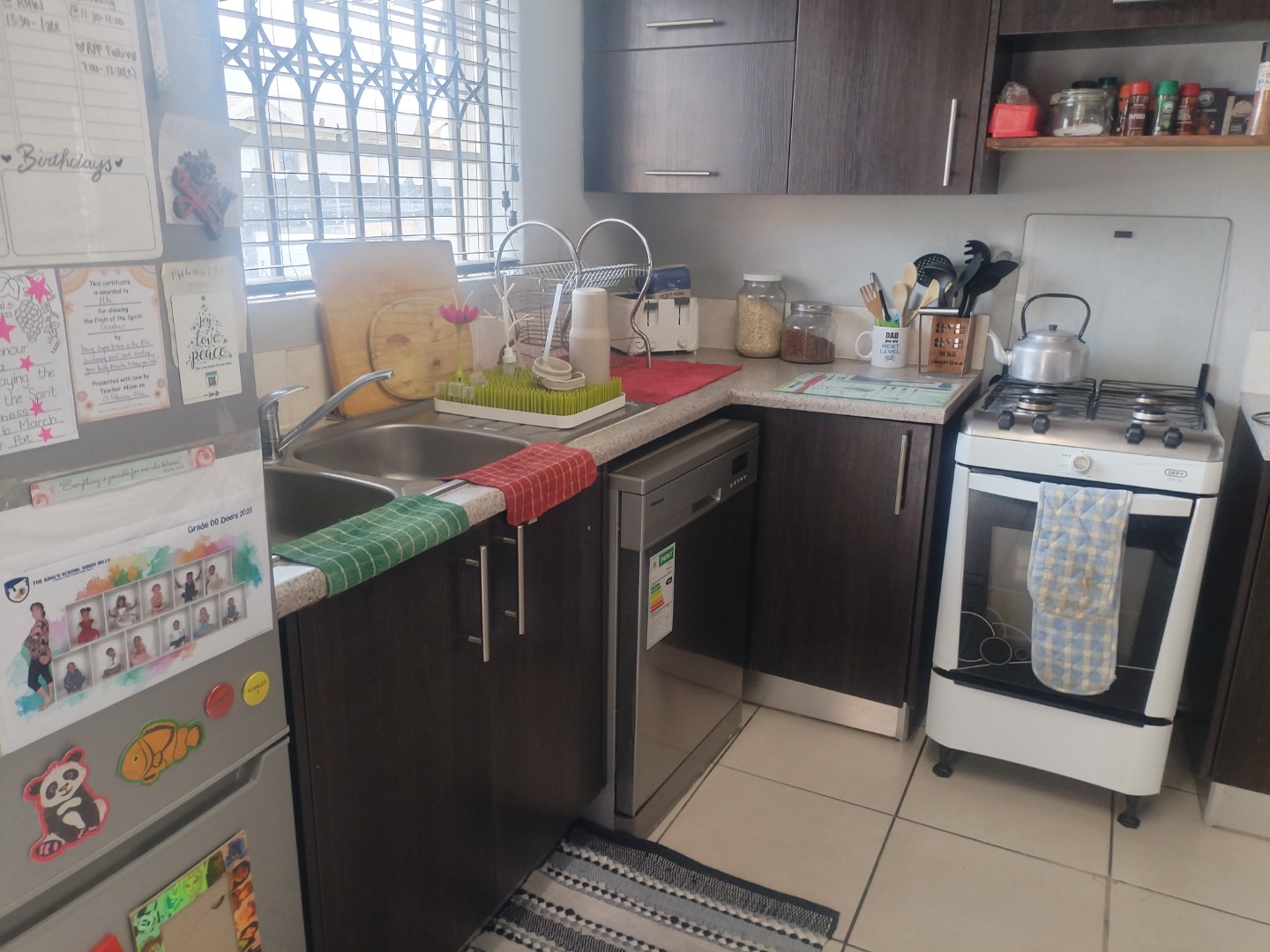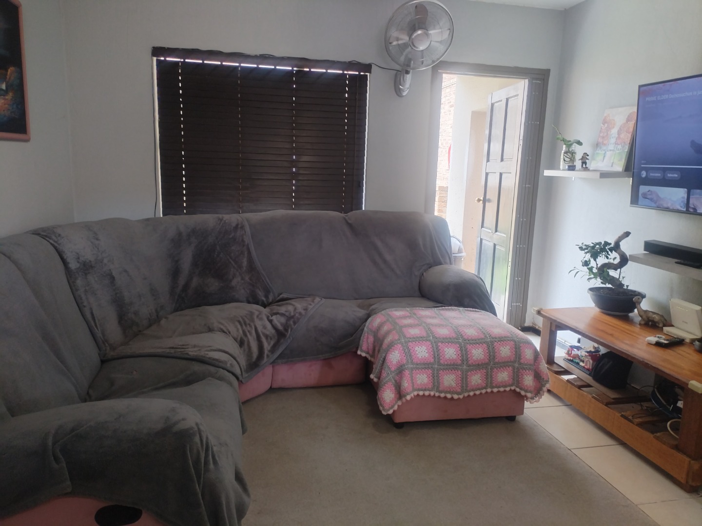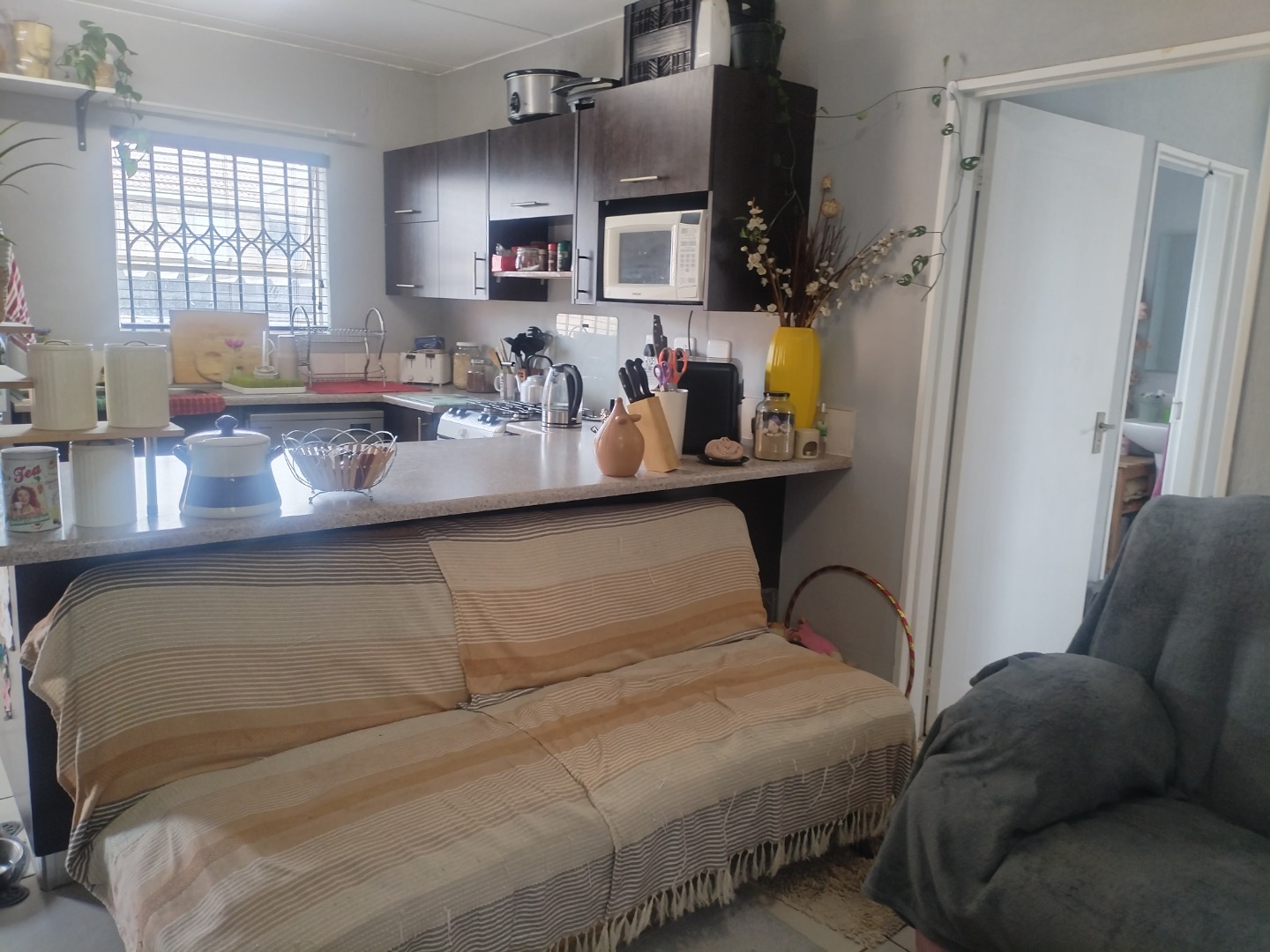 The open-plan kitchen is fitted with ample built-in cupboards and includes space for a washing machine and a single-door fridge. The spacious open-plan lounge flows seamlessly onto a covered patio, leading to a private yard — perfect for relaxing outdoors. All living areas and the kitchen are tiled.