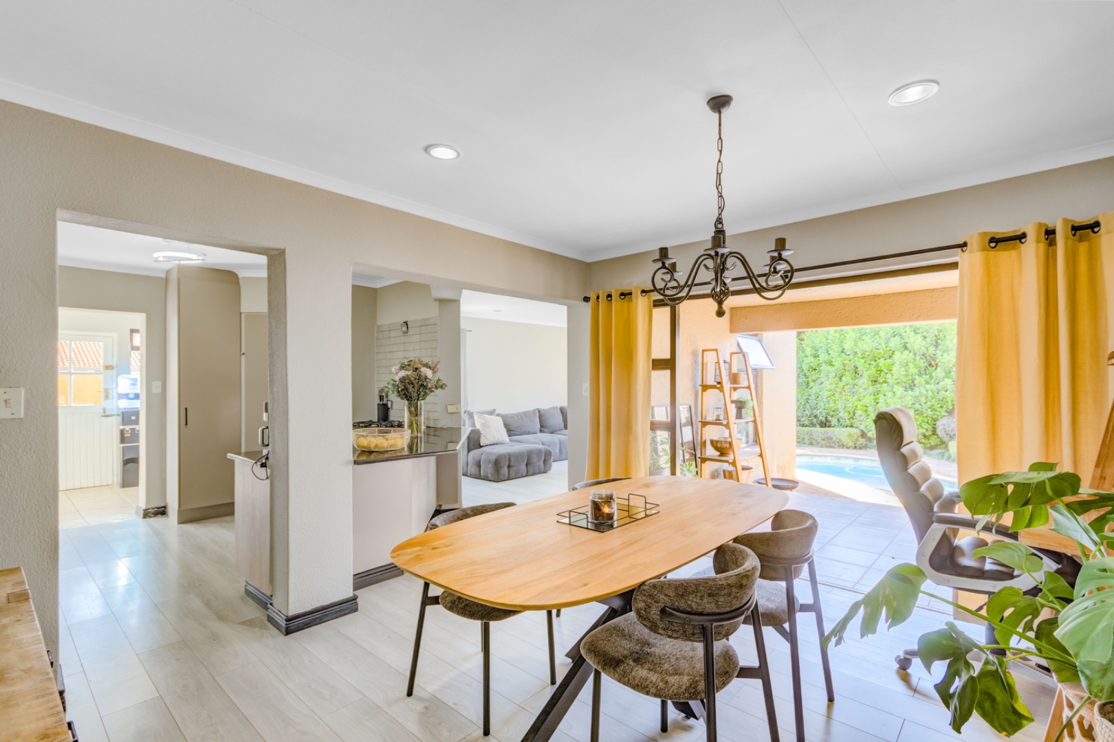 Open-plan dining area with stacking doors leading to the patio and pool – ideal for indoor-outdoor living