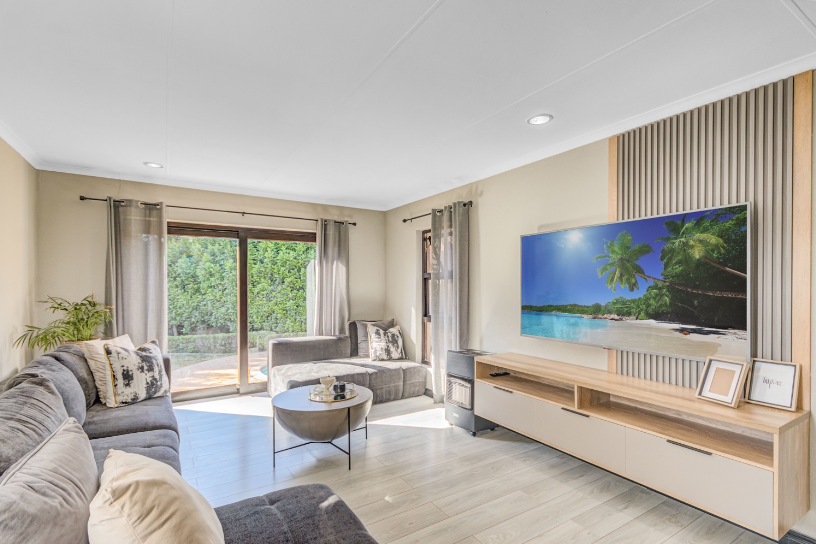 Spacious lounge with built-in TV stand and doors opening to the garden