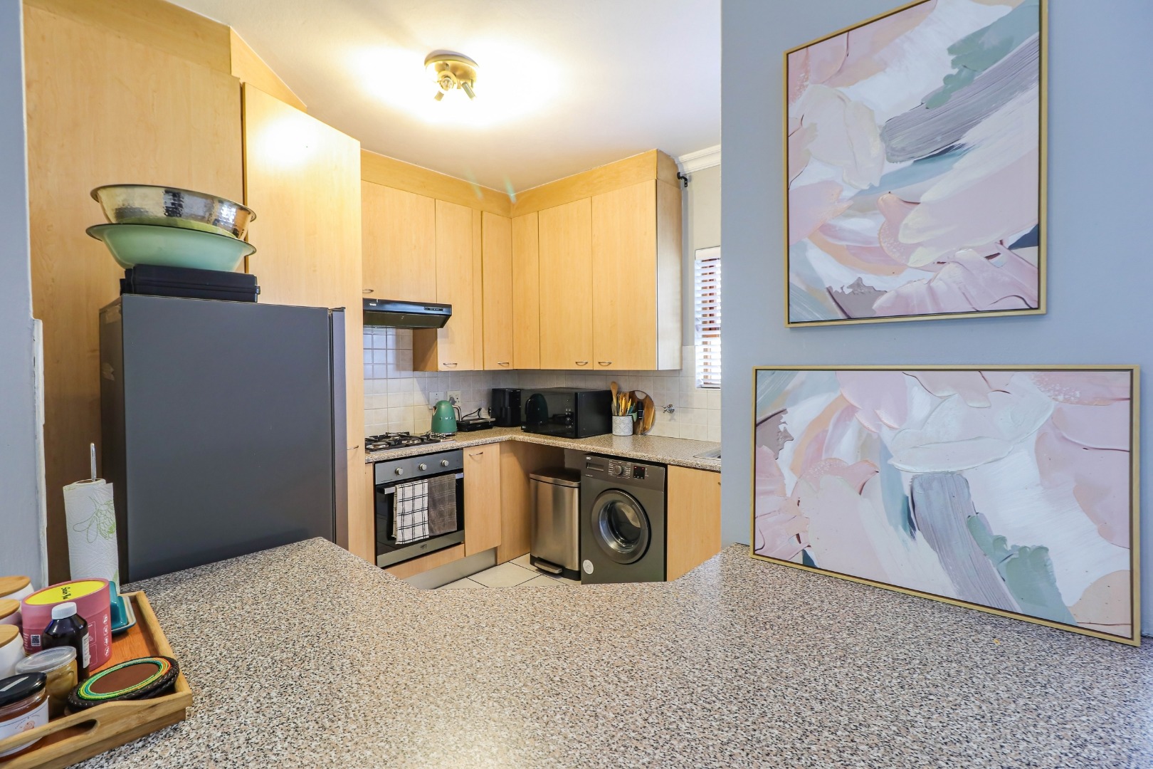 This unit offers a neat open kitchen with a gas hob and space for 3