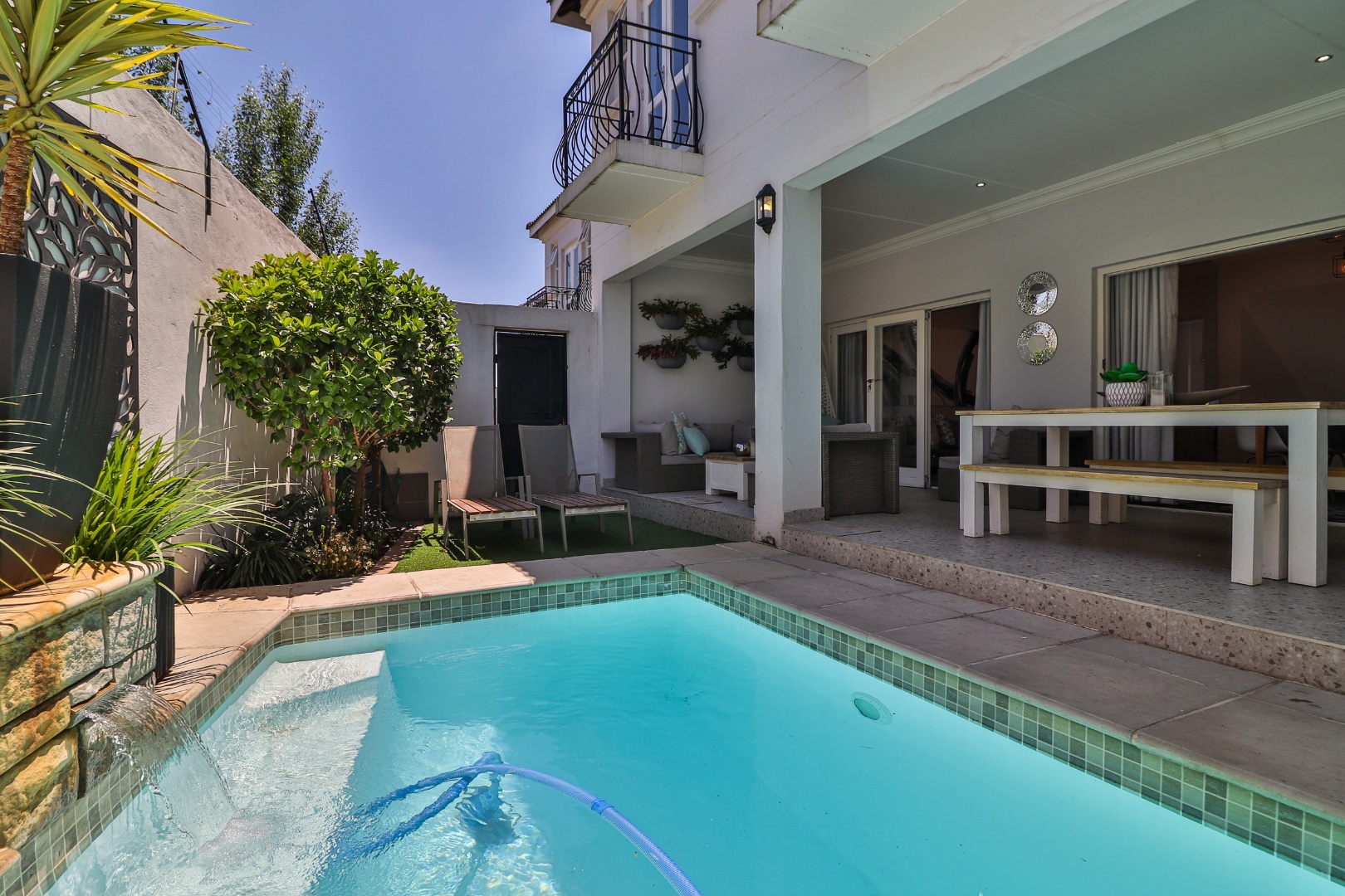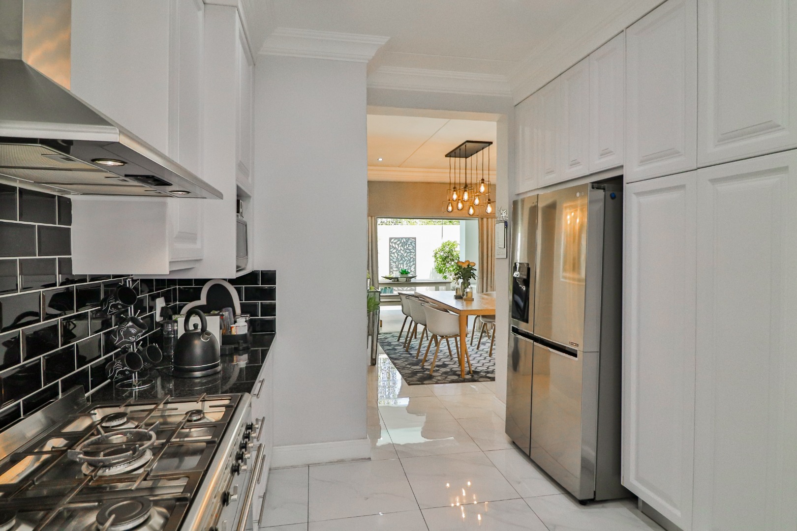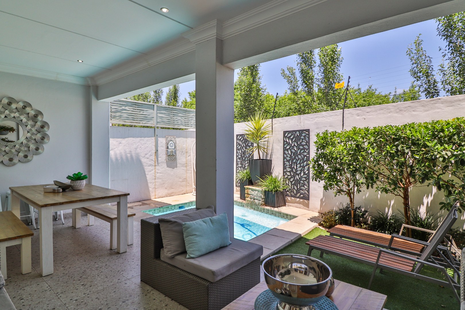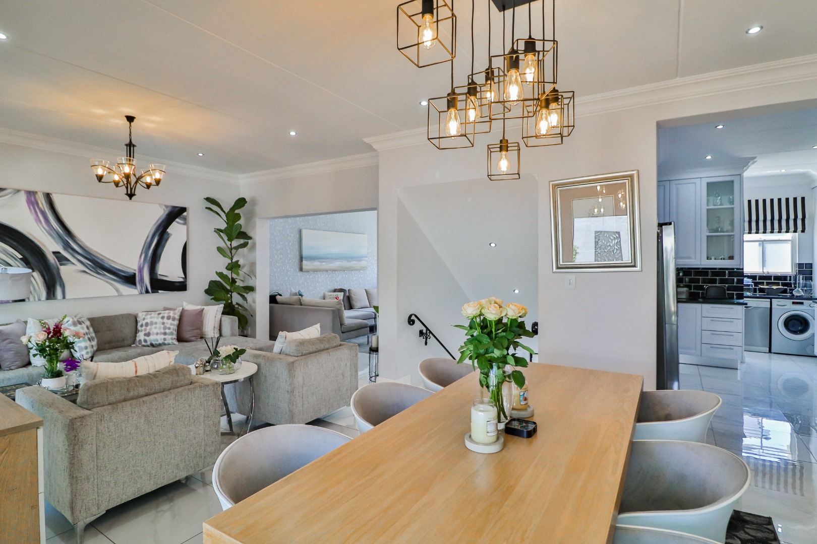 The exterior is a private oasis, featuring a sparkling swimming pool set within a manicured garden – an idyllic backdrop for relaxation and recreation. Security is paramount, with an access gate and electric fencing providing peace of mind within this exclusive complex. Further enhancing the modern lifestyle are three dedicated garages, fibre connectivity, generator and Jojo water storage tank ensuring uninterrupted luxury. This pet-friendly abode truly encapsulates sophisticated living.