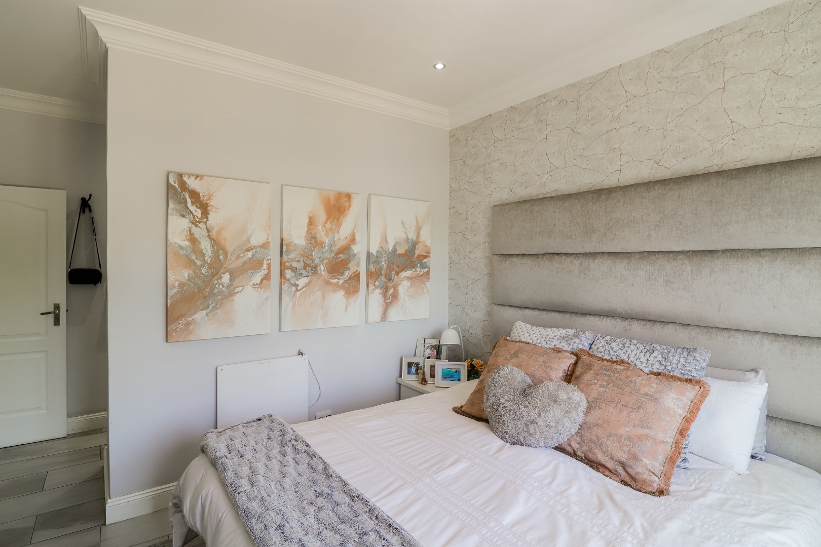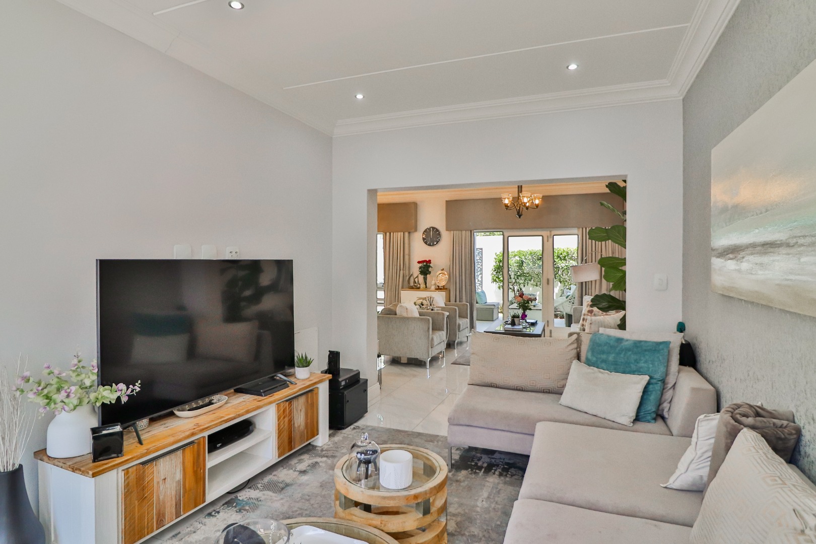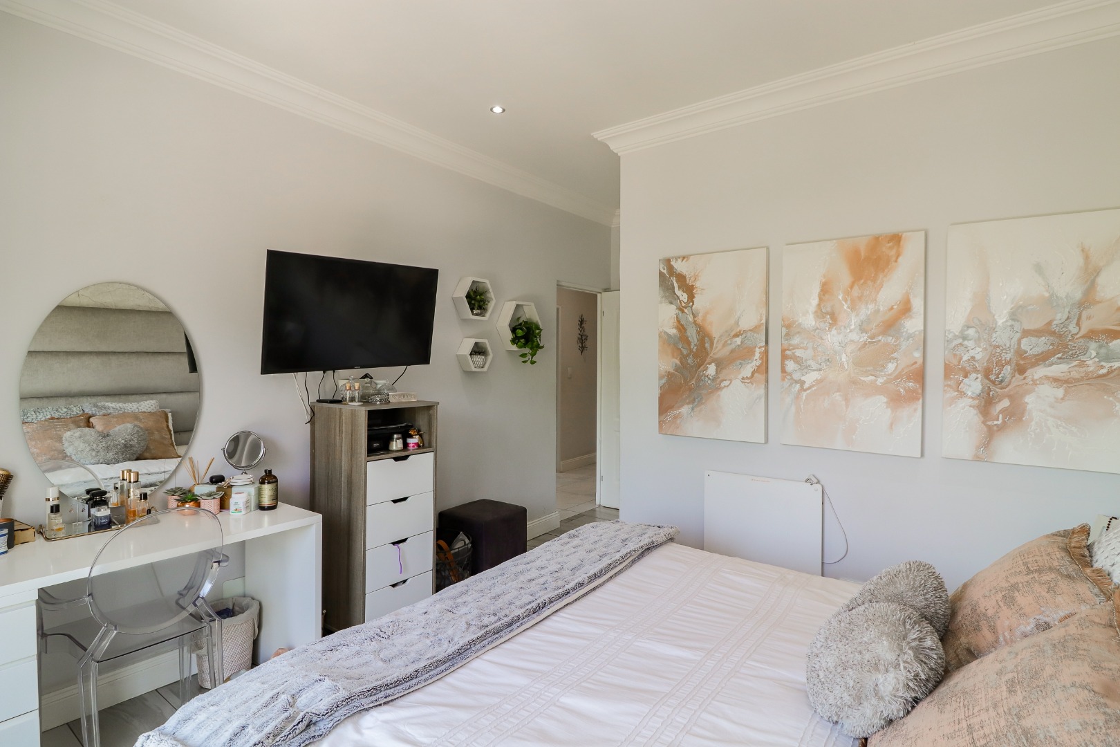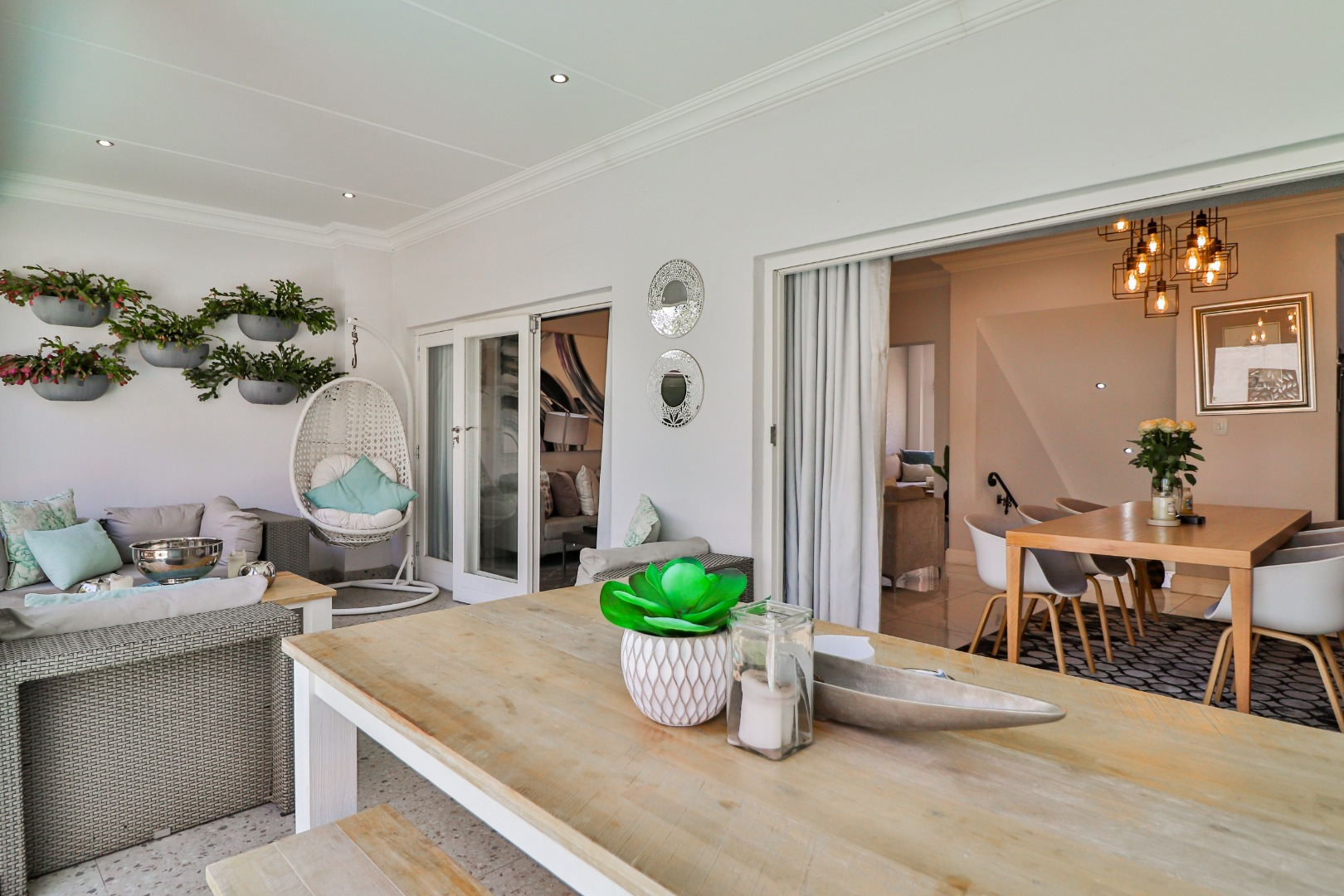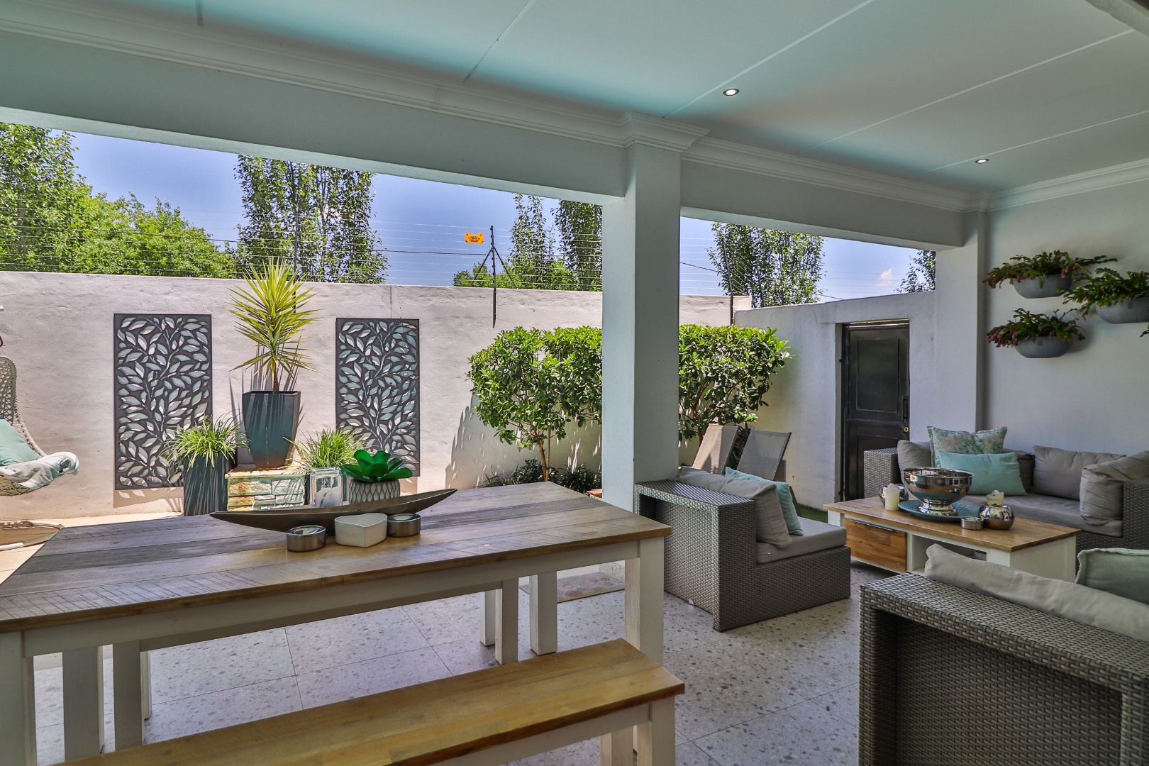 The exterior is a private oasis, featuring a sparkling swimming pool set within a manicured garden – an idyllic backdrop for relaxation and recreation. Security is paramount, with an access gate and electric fencing providing peace of mind within this exclusive complex. Further enhancing the modern lifestyle are three dedicated garages, fibre connectivity, generator and Jojo water storage tank ensuring uninterrupted luxury. This pet-friendly abode truly encapsulates sophisticated living.