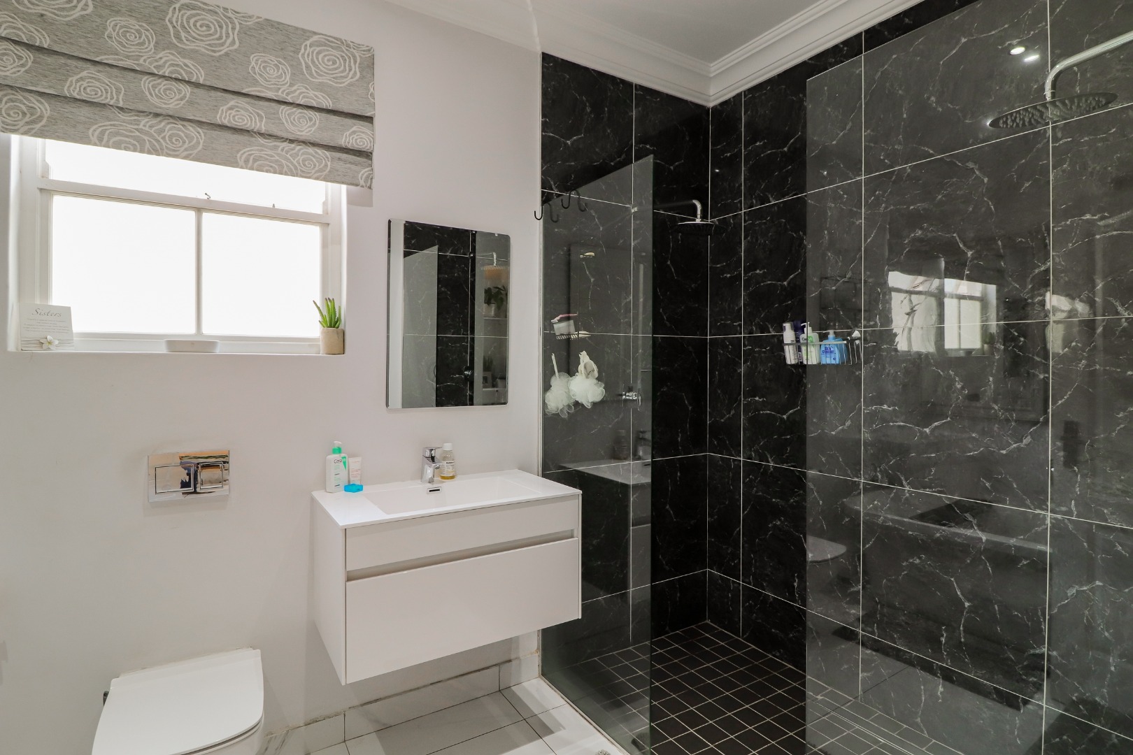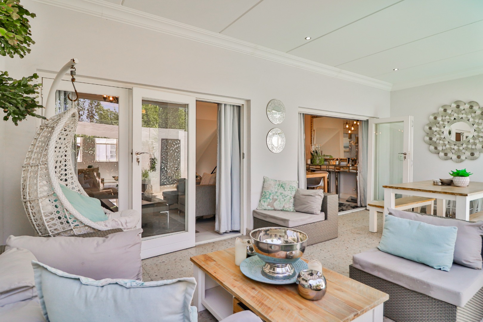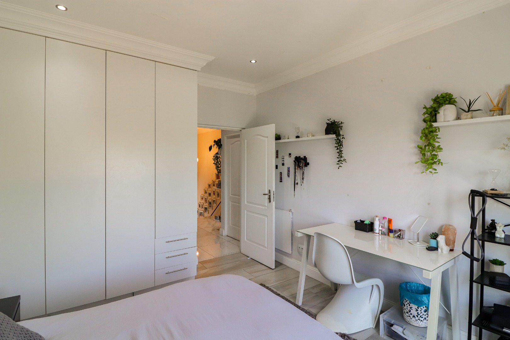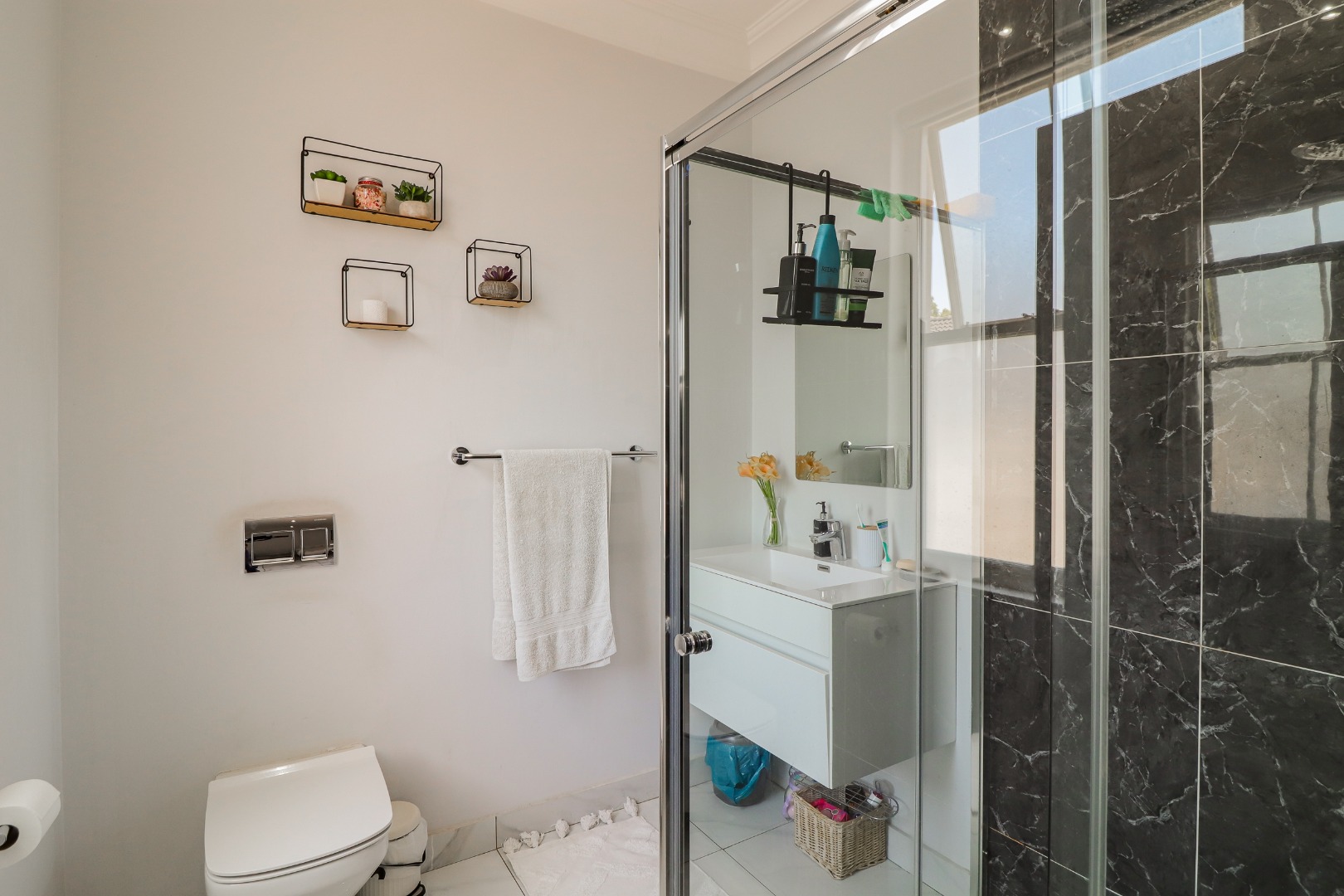 The exterior is a private oasis, featuring a sparkling swimming pool set within a manicured garden – an idyllic backdrop for relaxation and recreation. Security is paramount, with an access gate and electric fencing providing peace of mind within this exclusive complex. Further enhancing the modern lifestyle are three dedicated garages, fibre connectivity, generator and Jojo water storage tank ensuring uninterrupted luxury. This pet-friendly abode truly encapsulates sophisticated living.