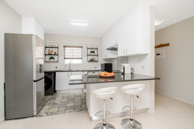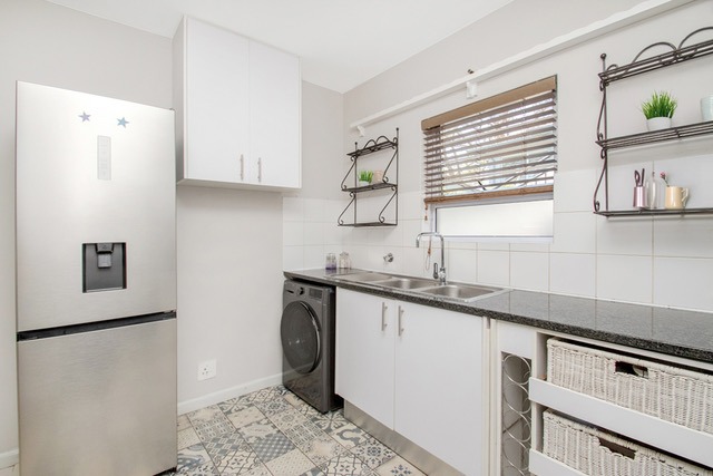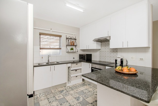 The entrance leads into an open-plan lounge and dining area that extends to a covered patio and spacious landscaped garden, perfect for entertaining and pets. The stylish kitchen features granite countertops, a breakfast counter, space for an under-counter appliance, a double sink, and ample storage.