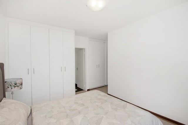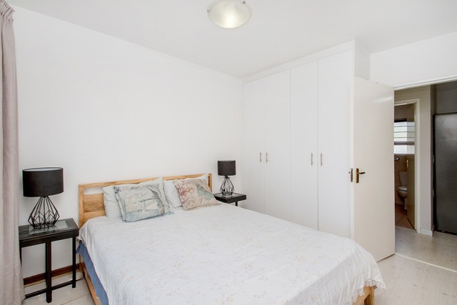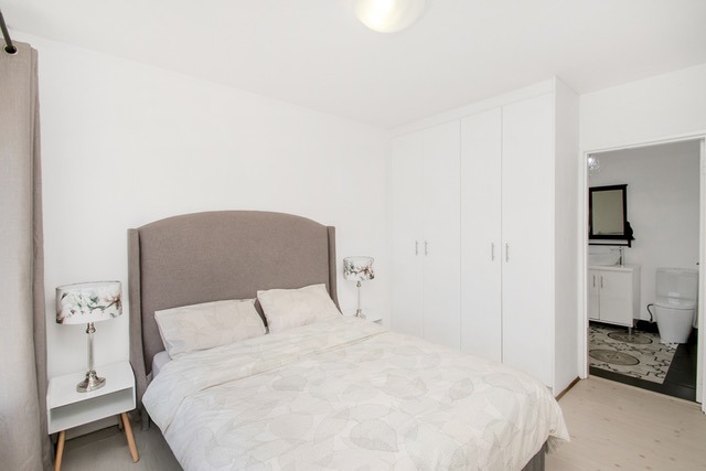 This apartment includes two spacious bedrooms with built-in wardrobes and laminate flooring. The master bedroom offers an en-suite bathroom with a bathtub, while a second bathroom with a shower is conveniently located near the second bedroom.