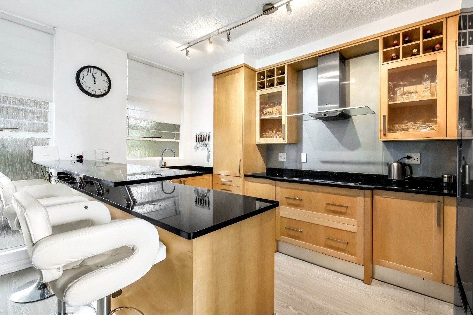 The front opens into a spacious entrance way adjoining the open plan kitchen which is fitted with granite counters and a glass topped bar ideal for entertaining guests while cooking. The kitchen has real wood cabinets with glass insets, Bosch eye level oven, microwave and extractor, Ceran 5-plate electric stove, modern Meissen sink and space for two undercounter appliances and a single door fridge.