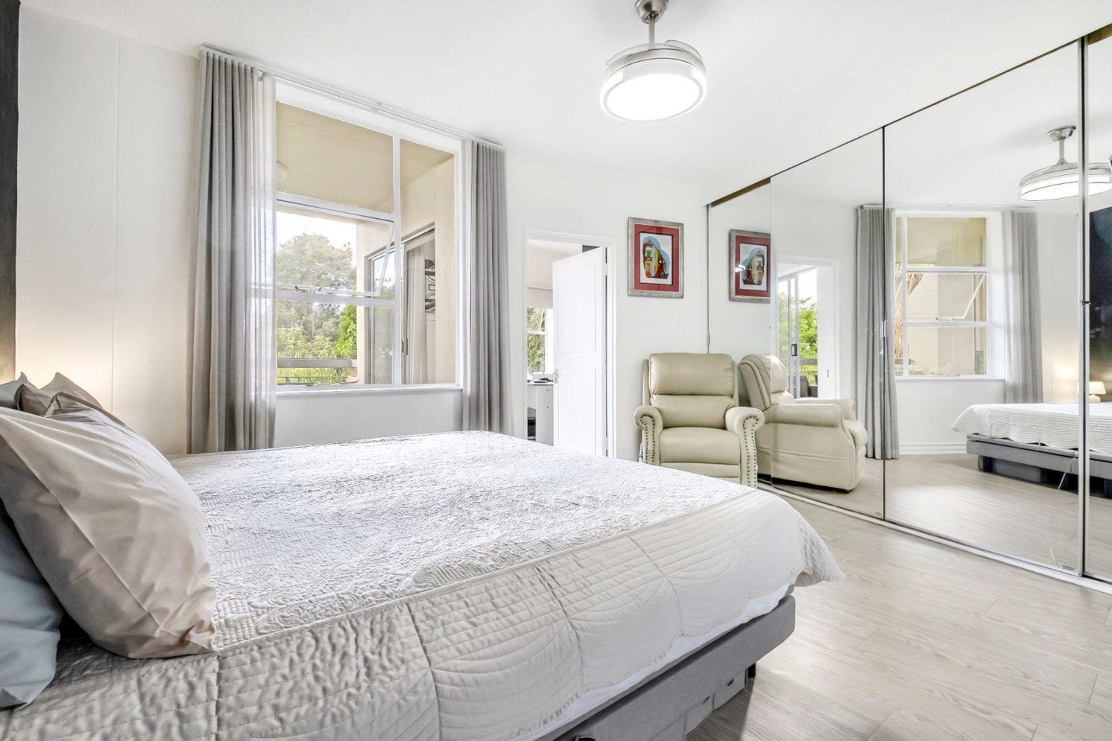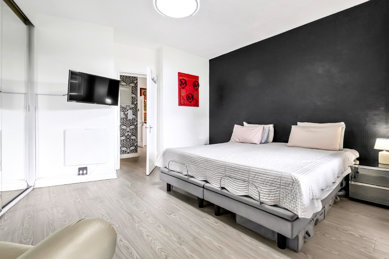 The bedroom is very well proportioned with mirrored wall to wall cupboards. The adjoining ante-room also has built-in cupboards, large windows and a door to the balcony.