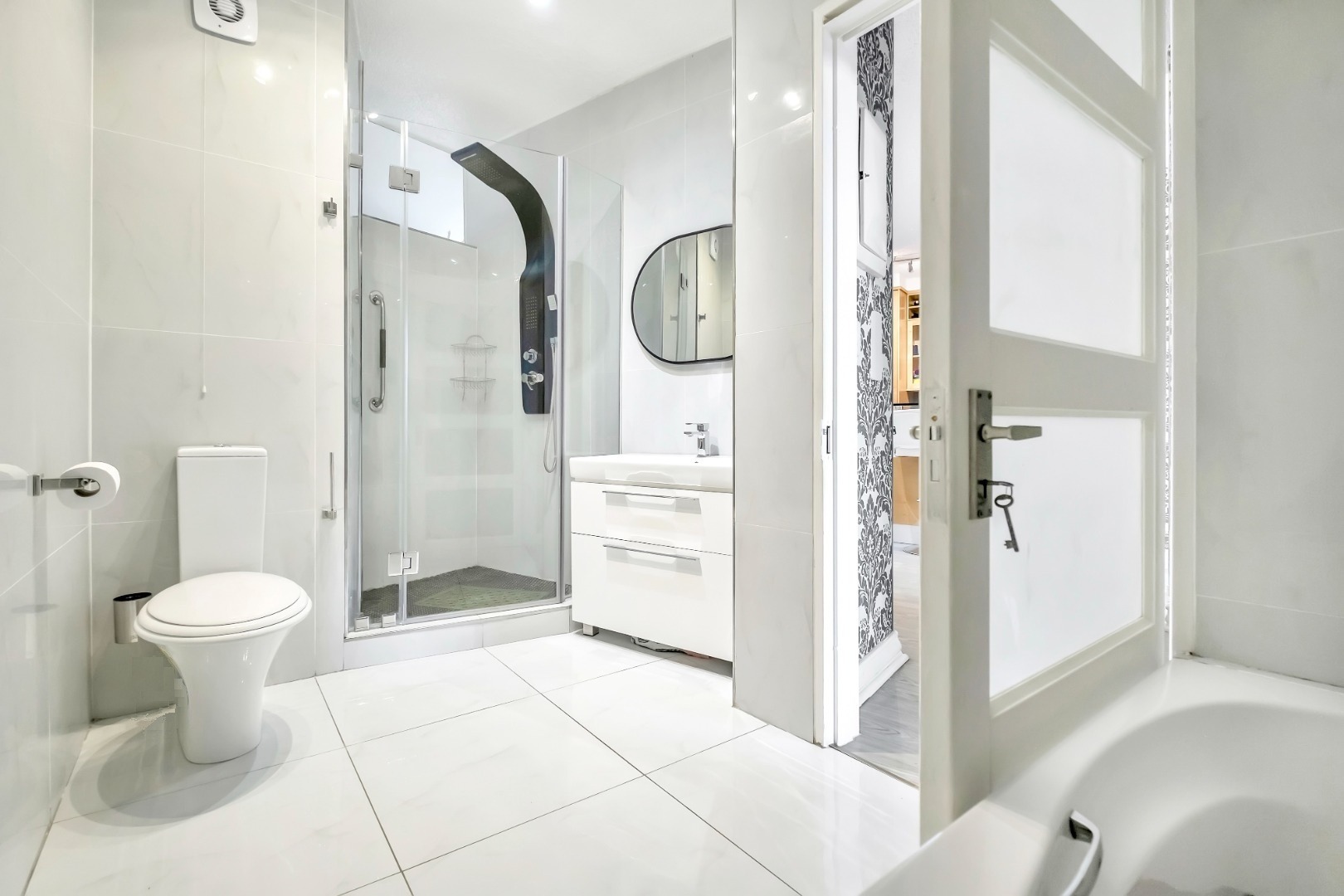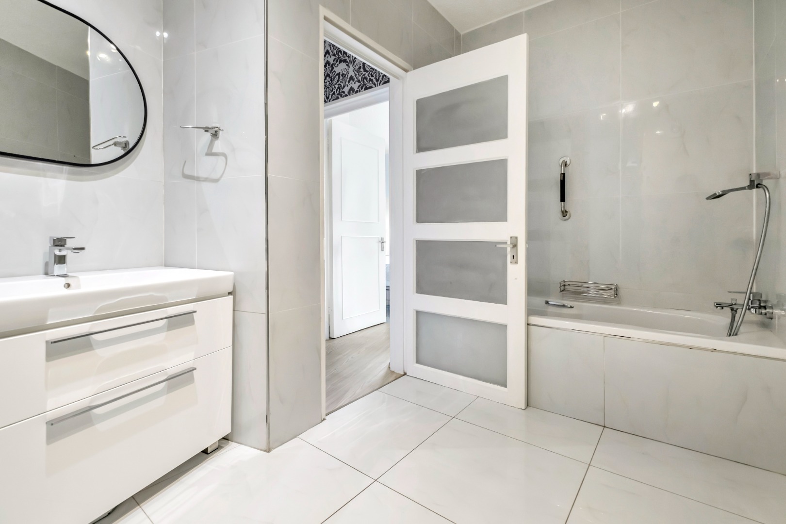 The bathroom has been beautifully renovated with glossy tiles floor to ceiling, Geberit fittings, jet shower, bath tub and extractor.