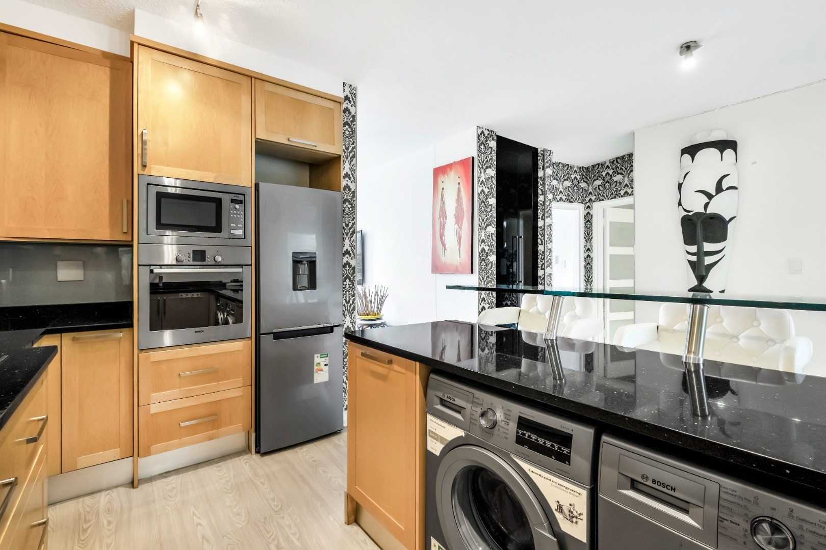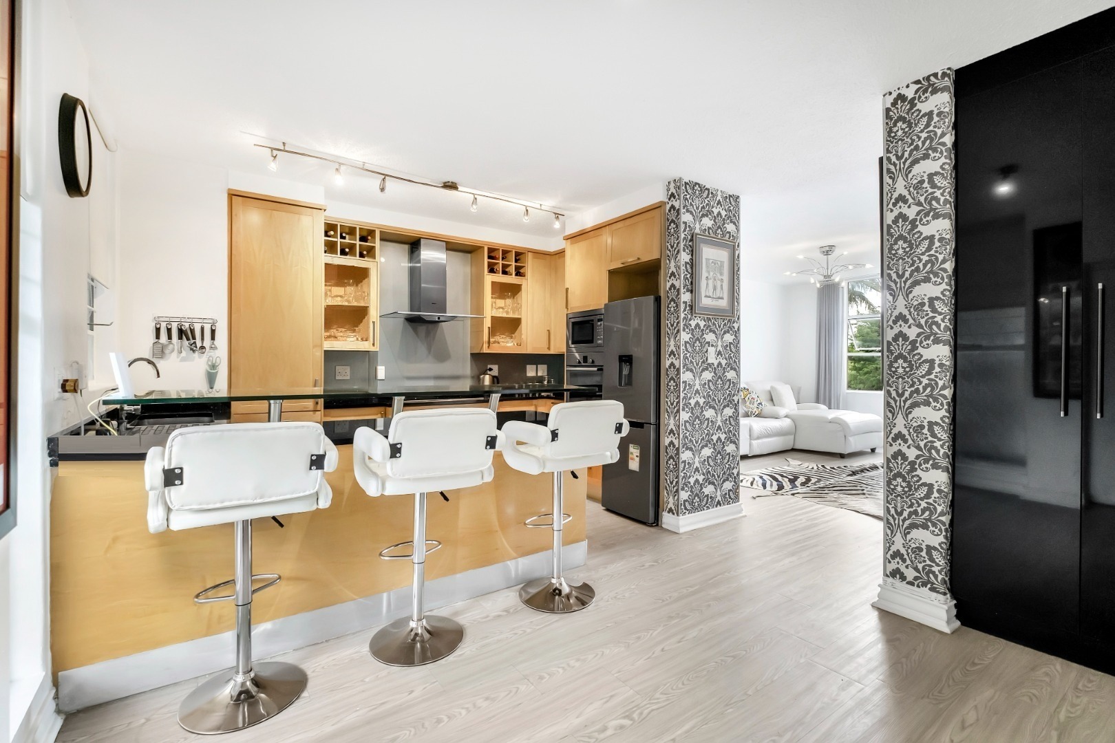 The front opens into a spacious entrance way adjoining the open plan kitchen which is fitted with granite counters and a glass topped bar ideal for entertaining guests while cooking. The kitchen has real wood cabinets with glass insets, Bosch eye level oven, microwave and extractor, Ceran 5-plate electric stove, modern Meissen sink and space for two undercounter appliances and a single door fridge.