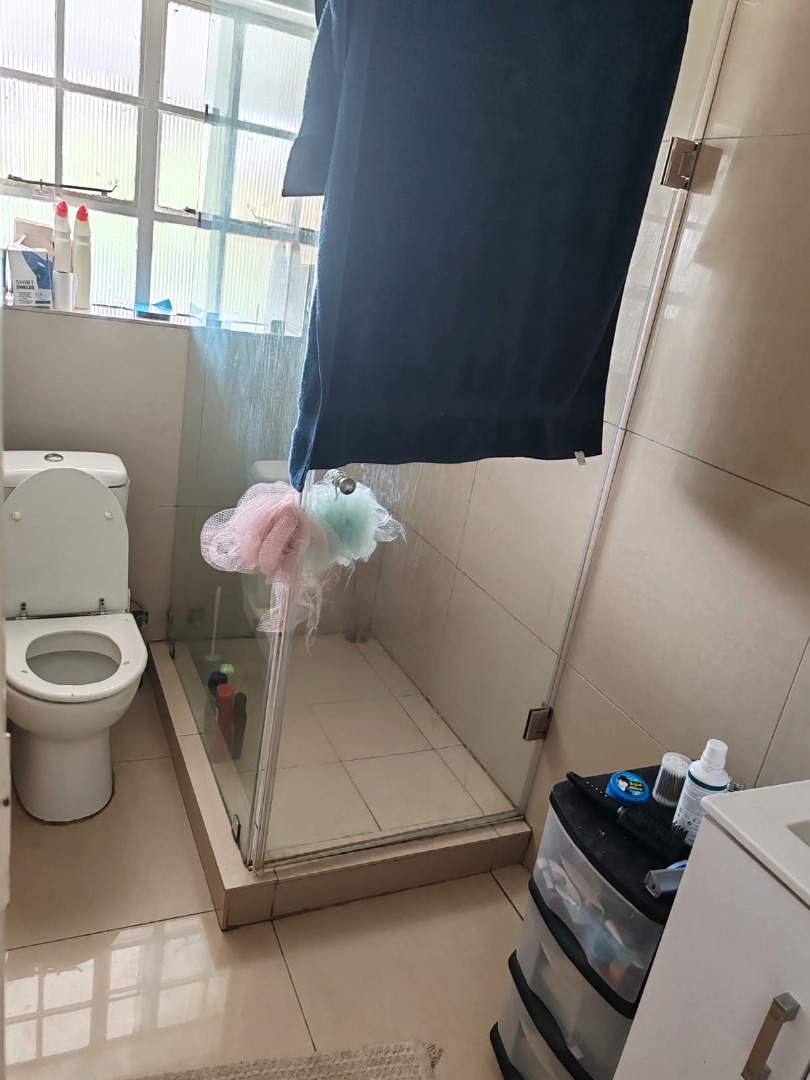 1 Bathroom with a glass shower cubicle, a toilet and a basin.